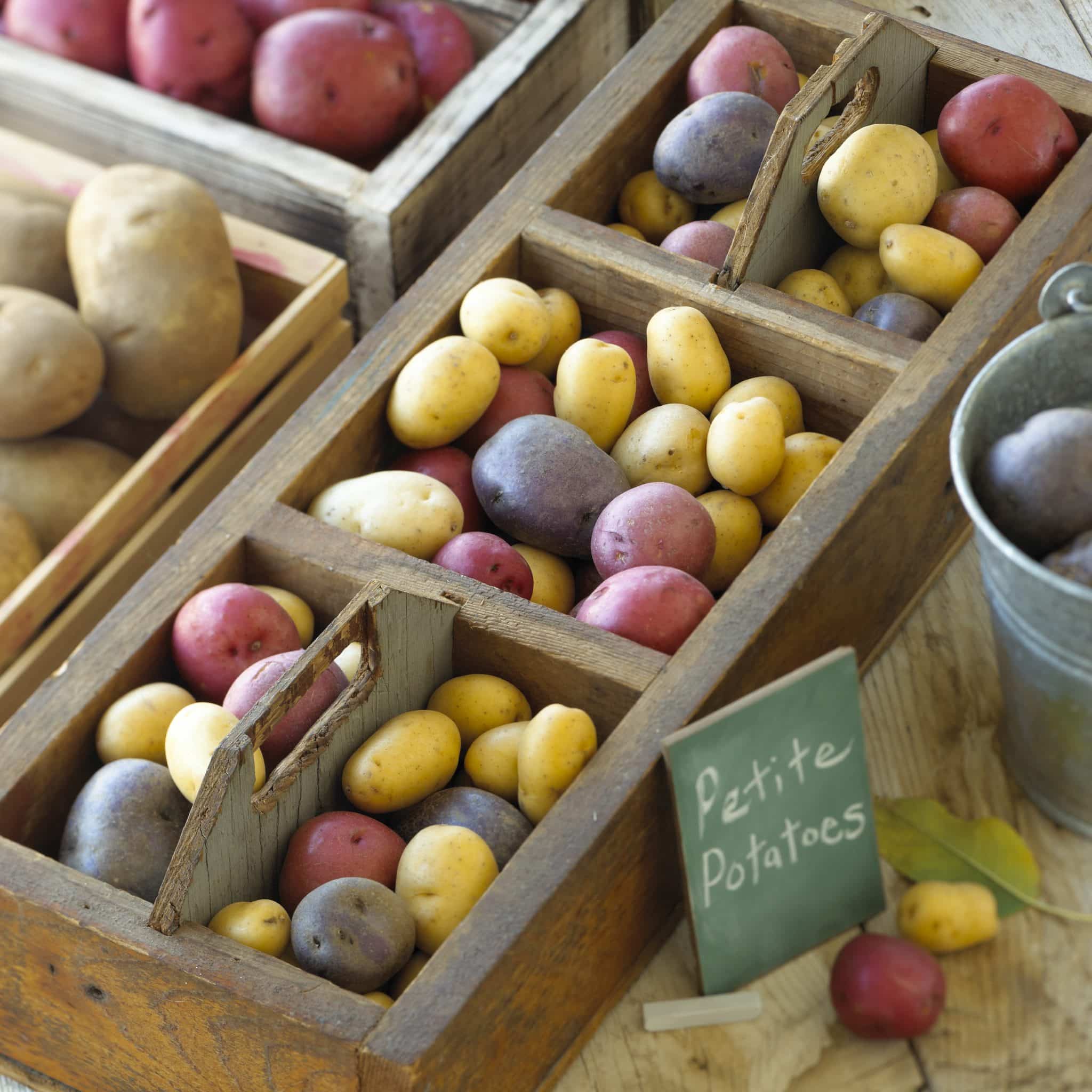 Katie Cavuto Boyle explains how to buy, store and cook these bite-sized bundles of deliciousness.  They are similar in texture and flavor to their larger-size cousins.  They are also referred to as “creamers”, “pearls” and “marbles”.  Add an unexpected pop of color to you salads and sides with these potatoes by boiling, roasting or pan-frying.  See our potato types page for more information about the different types of potatoes.