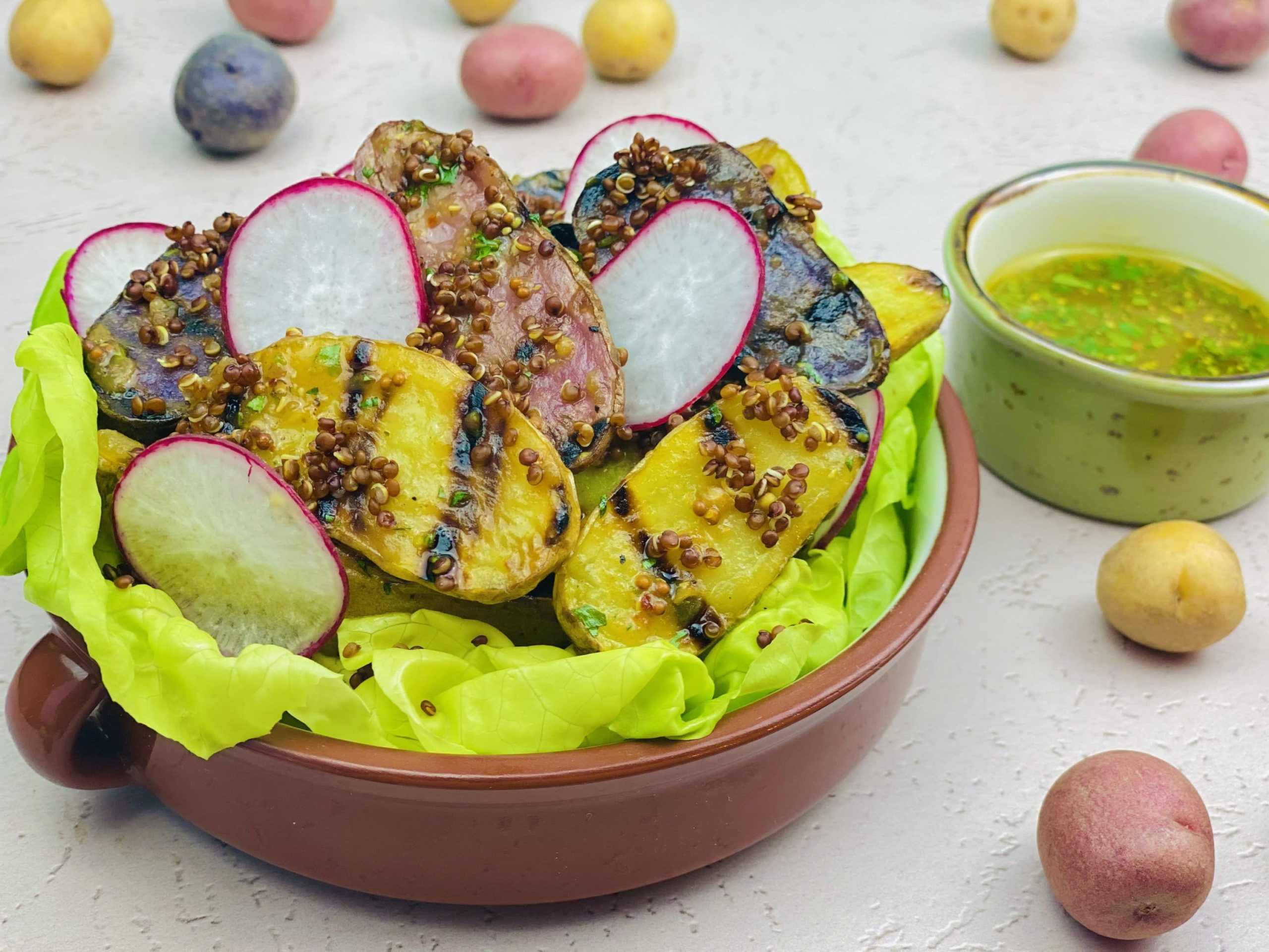 Grilled Fingerling Potatoes with Green Chili Vinaigrette, Red Quinoa and Radish
