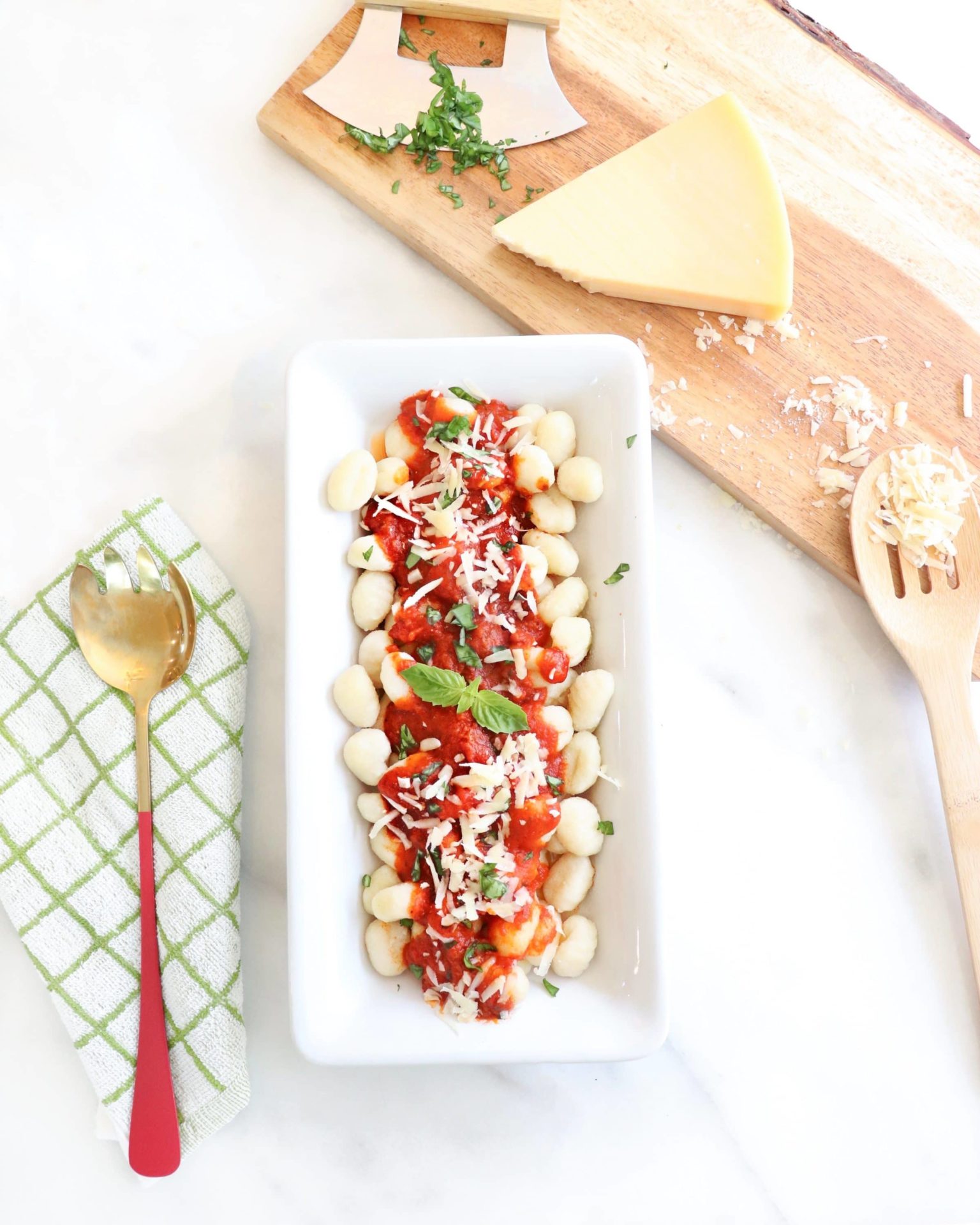 8. Serve with homemade tomato basil sauce and garnish with more Parmesan and fresh basil.