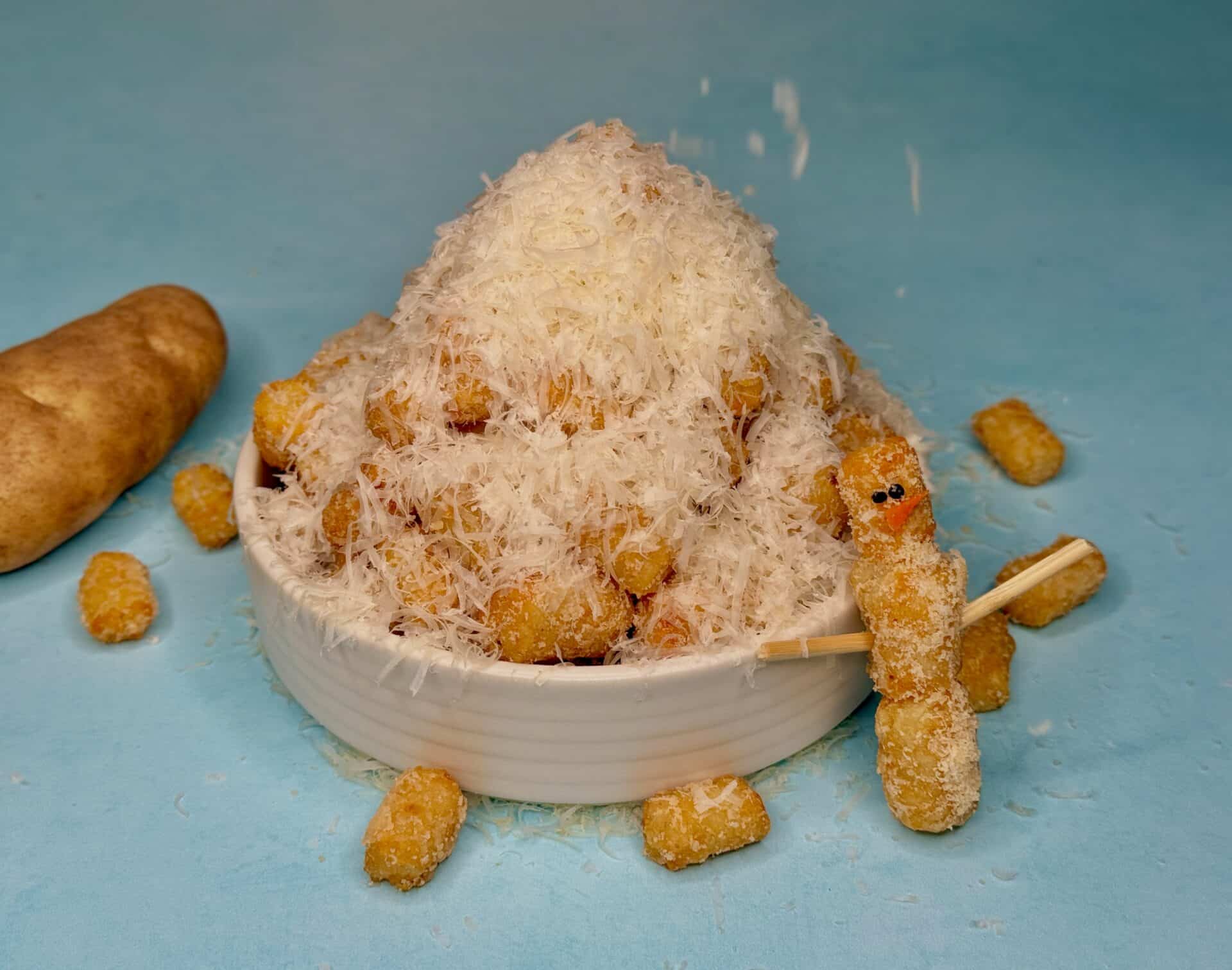 Abominable Snow Tots turn snack time into playtime. Crispy, golden potato tots coated in a fluffy drift of grated Parmesan that looks (and tastes) like fresh-fallen snow. Build your own mini snowmen, sprinkle on extra “snow,” and bite into pure potato bliss.