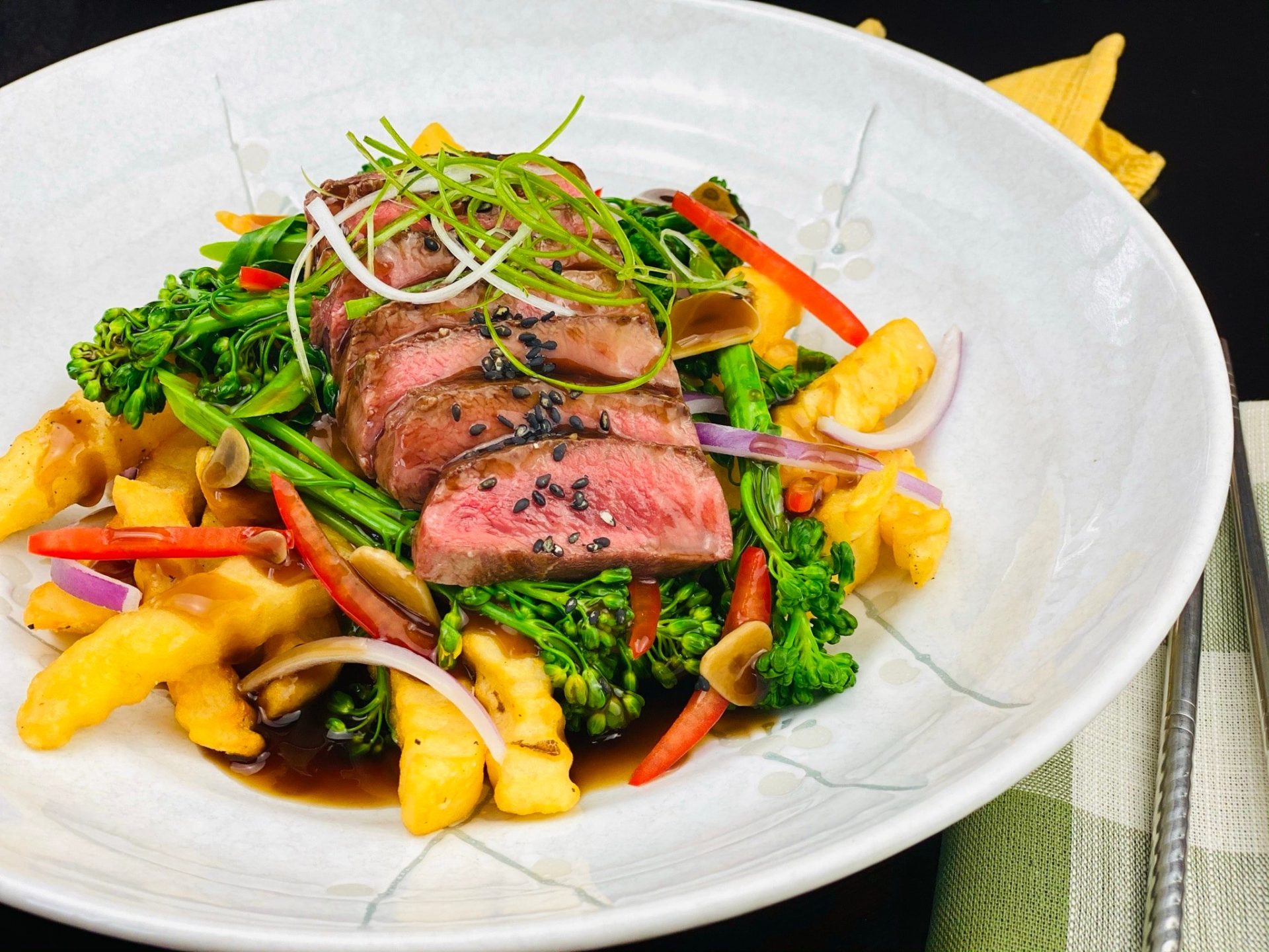 Crispy crinkle-cut fries topped with soy-glazed flatiron steak, flavorful broccoli, red bell pepper, onions, and scallions.