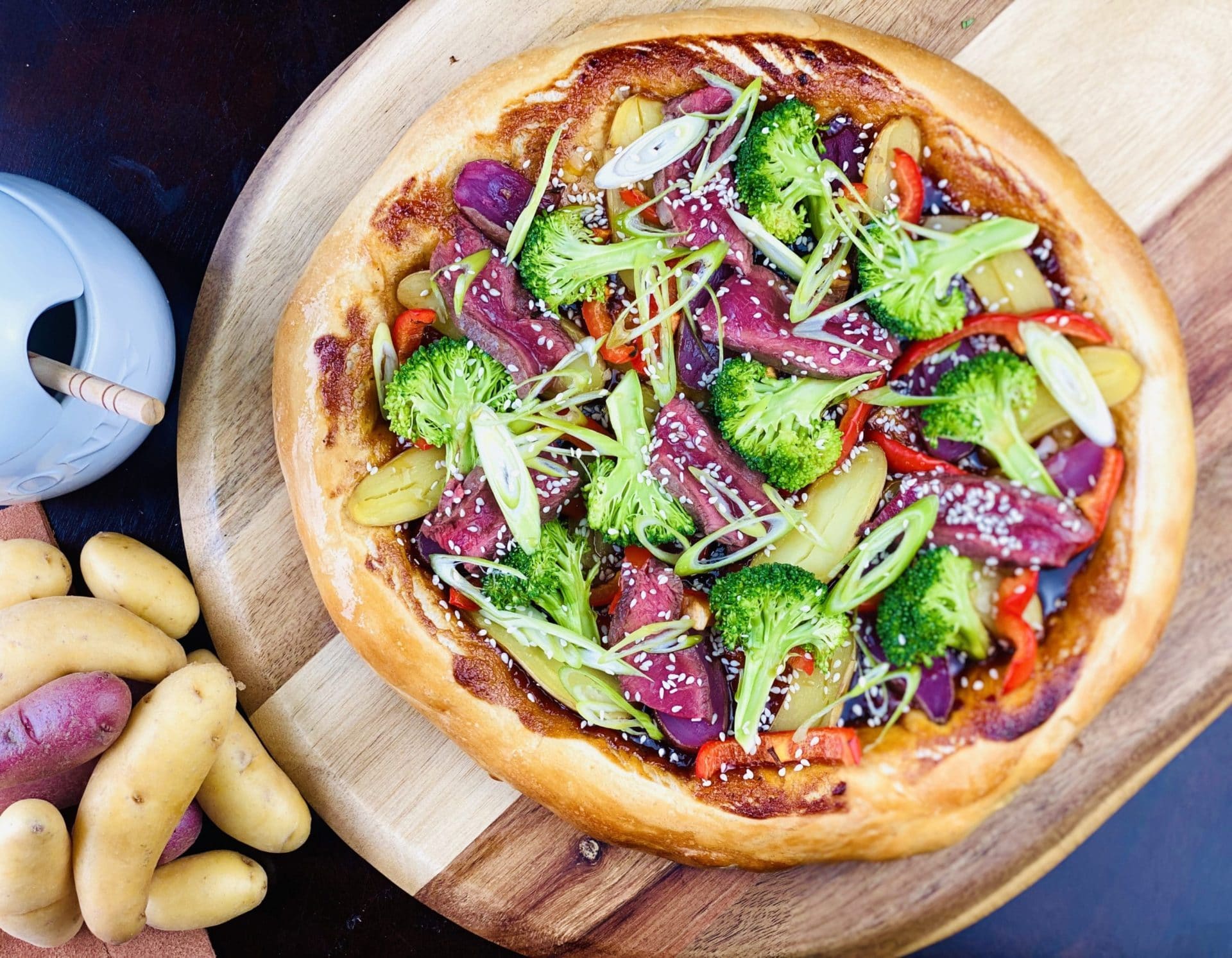 Stir fry beef and broccoli with fingerling potatoes on a pizza.