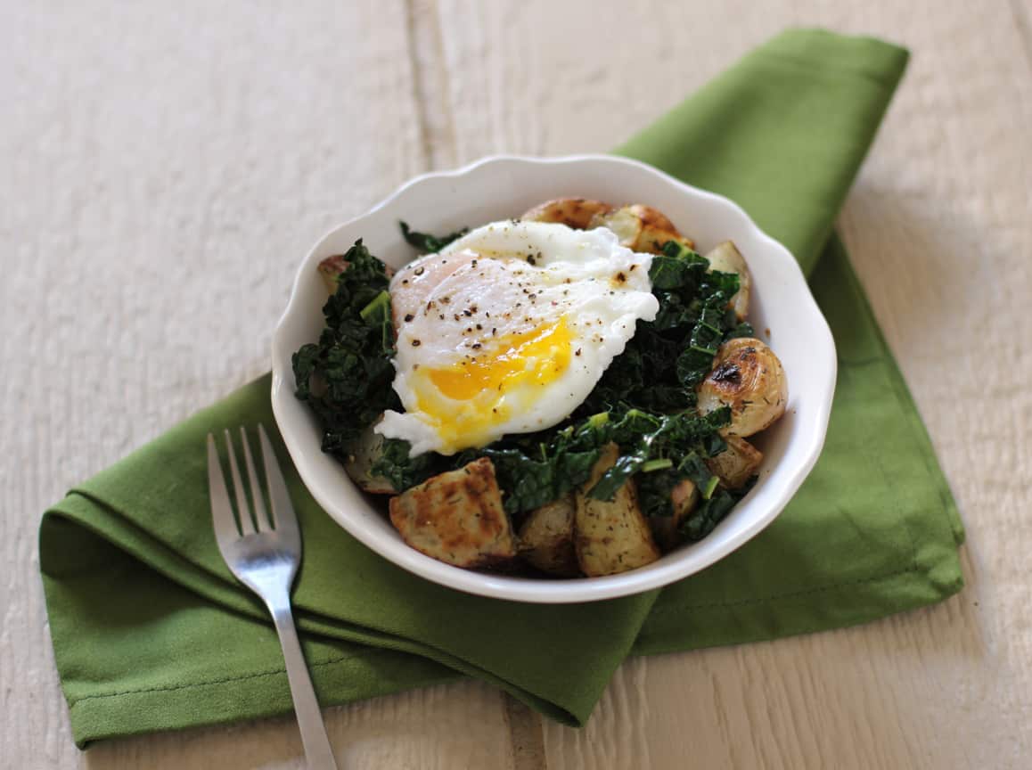 Braised Kale with Roasted Potatoes and Poached Eggs