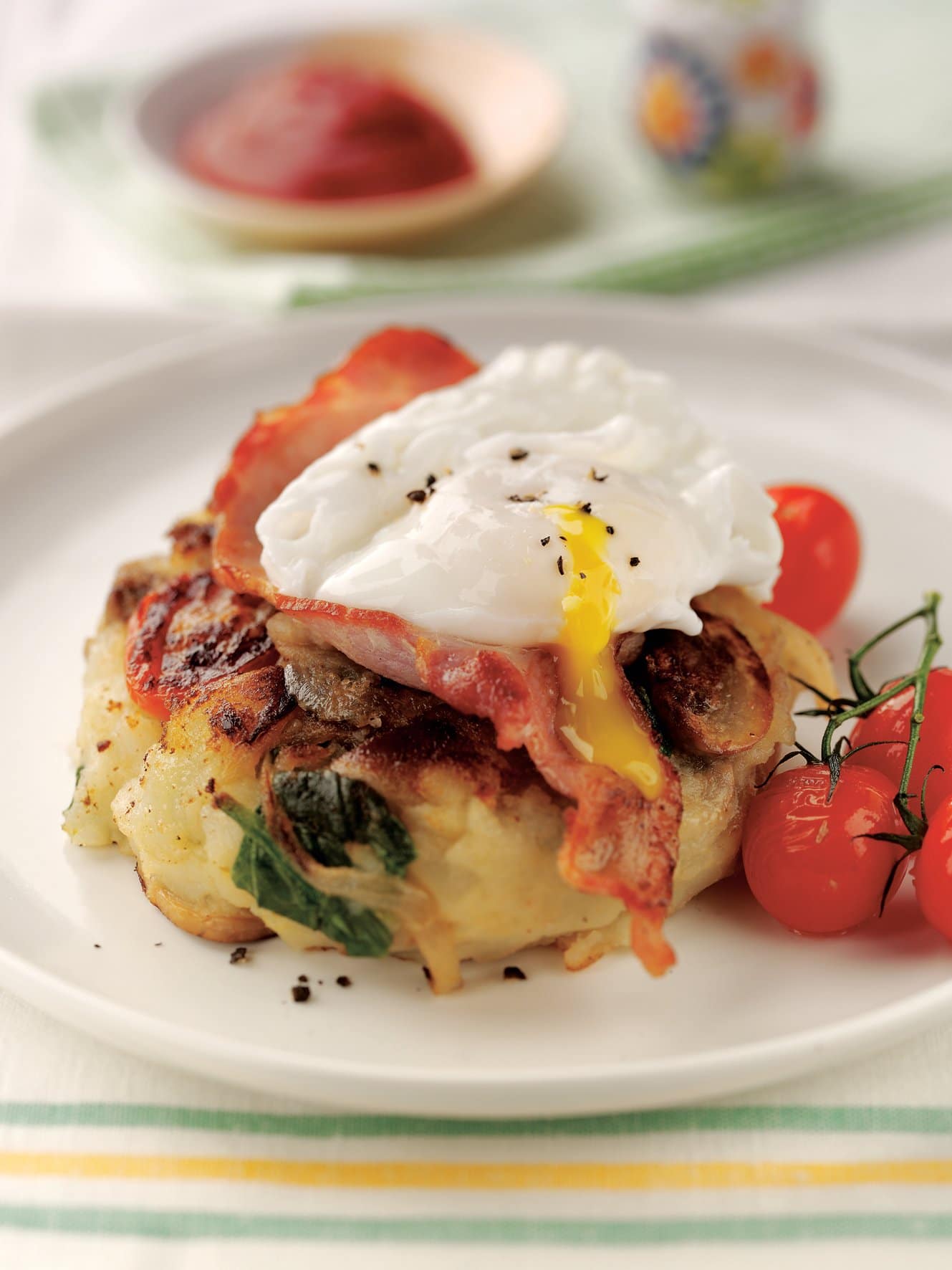 6. Divide the potato hash into 4 rounds. Heat the remaining oil in a large frying pan and fry the hash rounds for 2 minutes on each side.