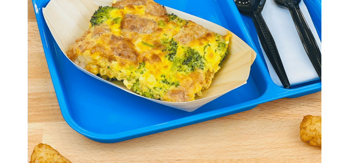 6. In a large, oiled parchment paper lined 2 inch deep, full hotel pan, place tater drums (12 cups) and broccoli florets (6 cups) then add egg cheese mixture right over then cover with foil that has been lightly sprayed with pan spray and bake for 40-45 minutes or until the egg mixture sets and the internal temperature is 160 F (71 C) Then remove foil and bake for another 5 minutes or until golden.