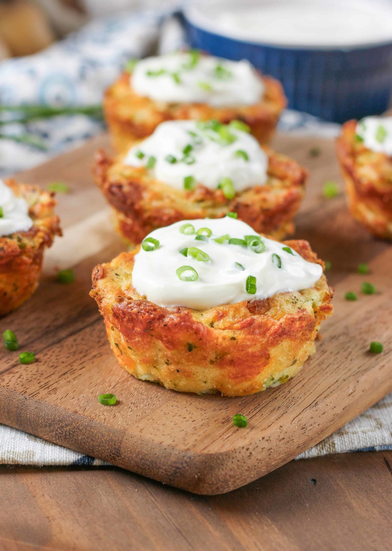 7. Remove muffin tin to a wire rack to cool for about 5 minutes. Carefully remove potato puffs from tin to serving platter. Top with sour cream and additional chopped chives. Serve immediately.