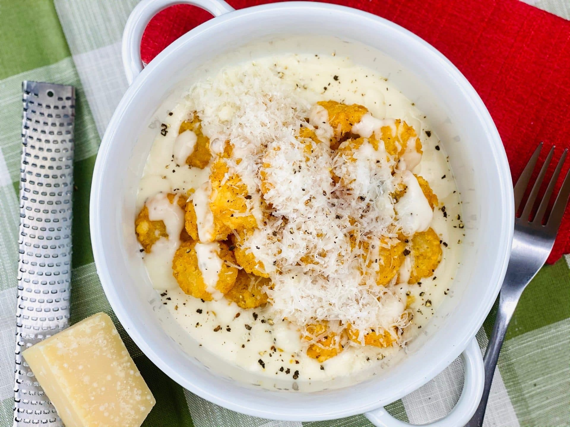 3. To plate, spoons some of the sauce in the bottom of a serving dish. Nestle the potatoes on the sauce and spoon a little more sauce on top. Sprinkle the potatoes with some of the grated cheese and fresh cracked black pepper.  Serve immediately. Enjoy!