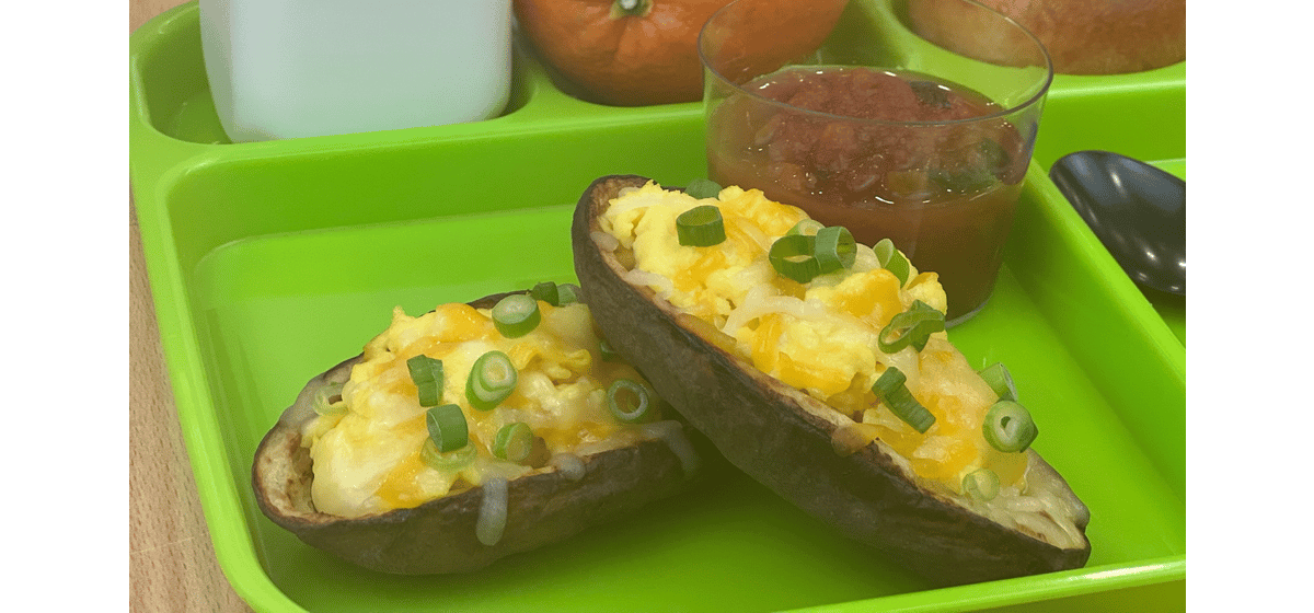 Crispy baked Russet potato half shells filled with light and fluffy scrambled eggs, topped with scrumptious melted cheddar cheese.
