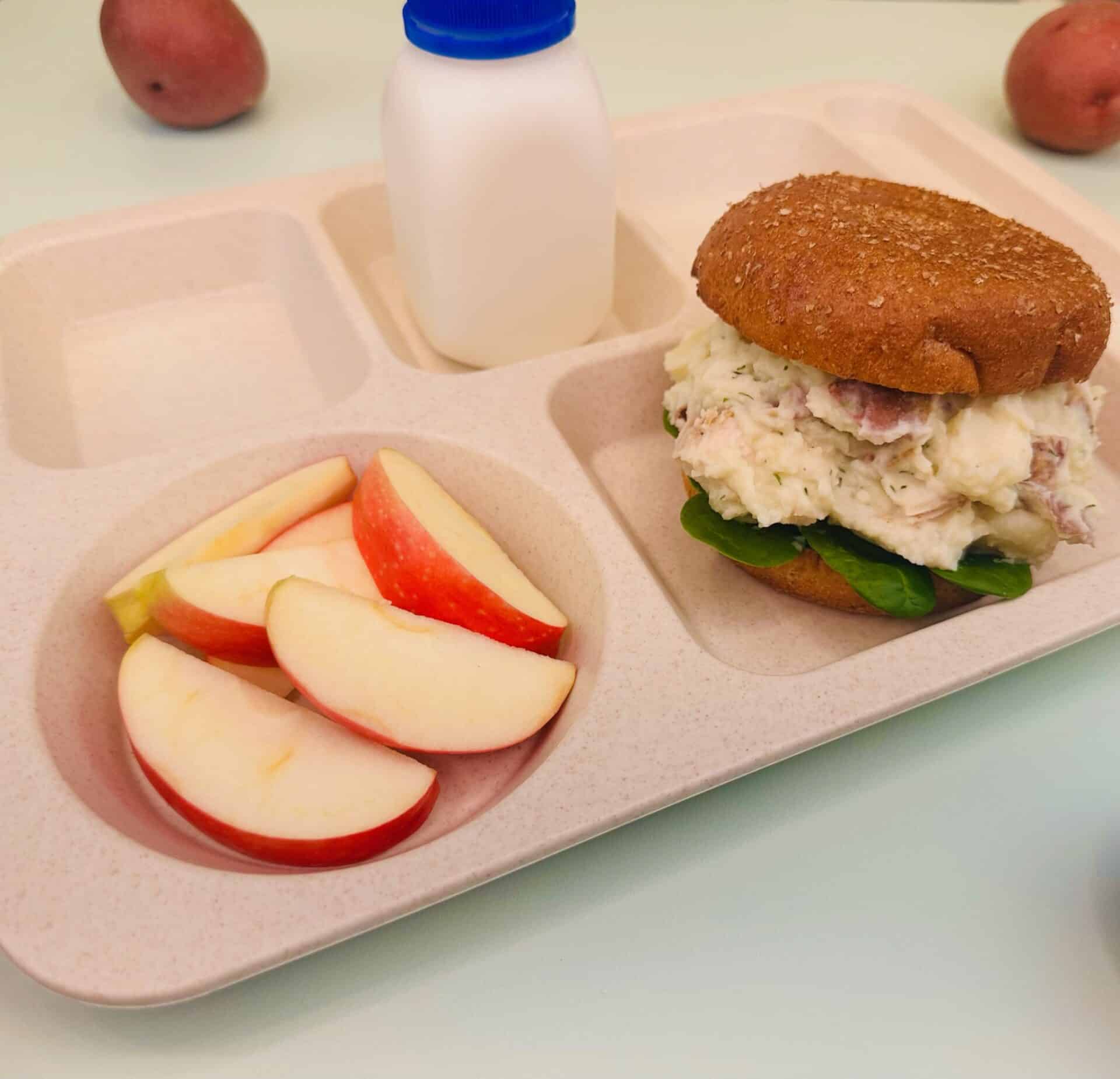 7. To assemble, lay buns or slices, then place spinach on the bottom then spread chicken and potato salad over, and cover with the top part of the bun or sliced bread.