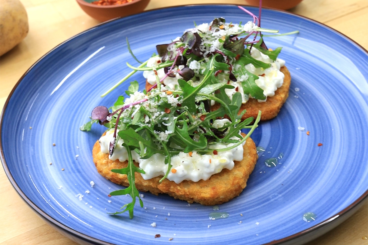 6. Top the hash brown patties with cottage cheese and the dressed microgreens. Top with a drizzle of EVOO and the crushed red chili flakes. Option to grate some parmesan over the top. Enjoy!