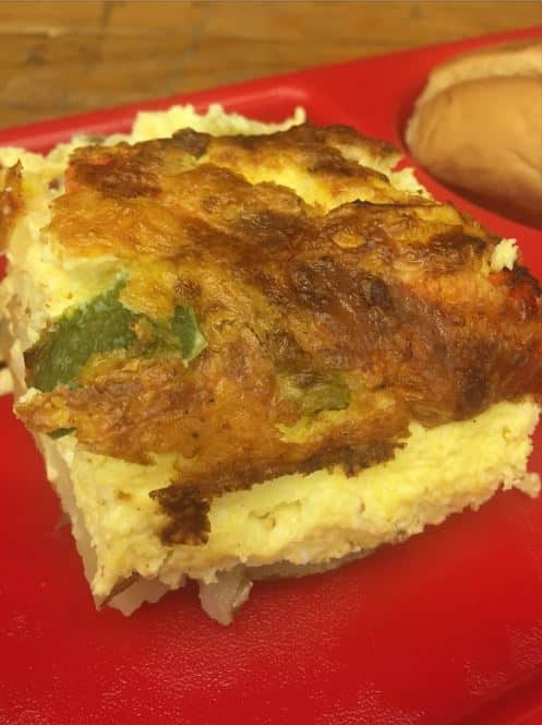4. Bake for 30 minutes at 350 degrees Fahrenheit or until center is set. Let stand for 10 minutes, cut into squares and serve.