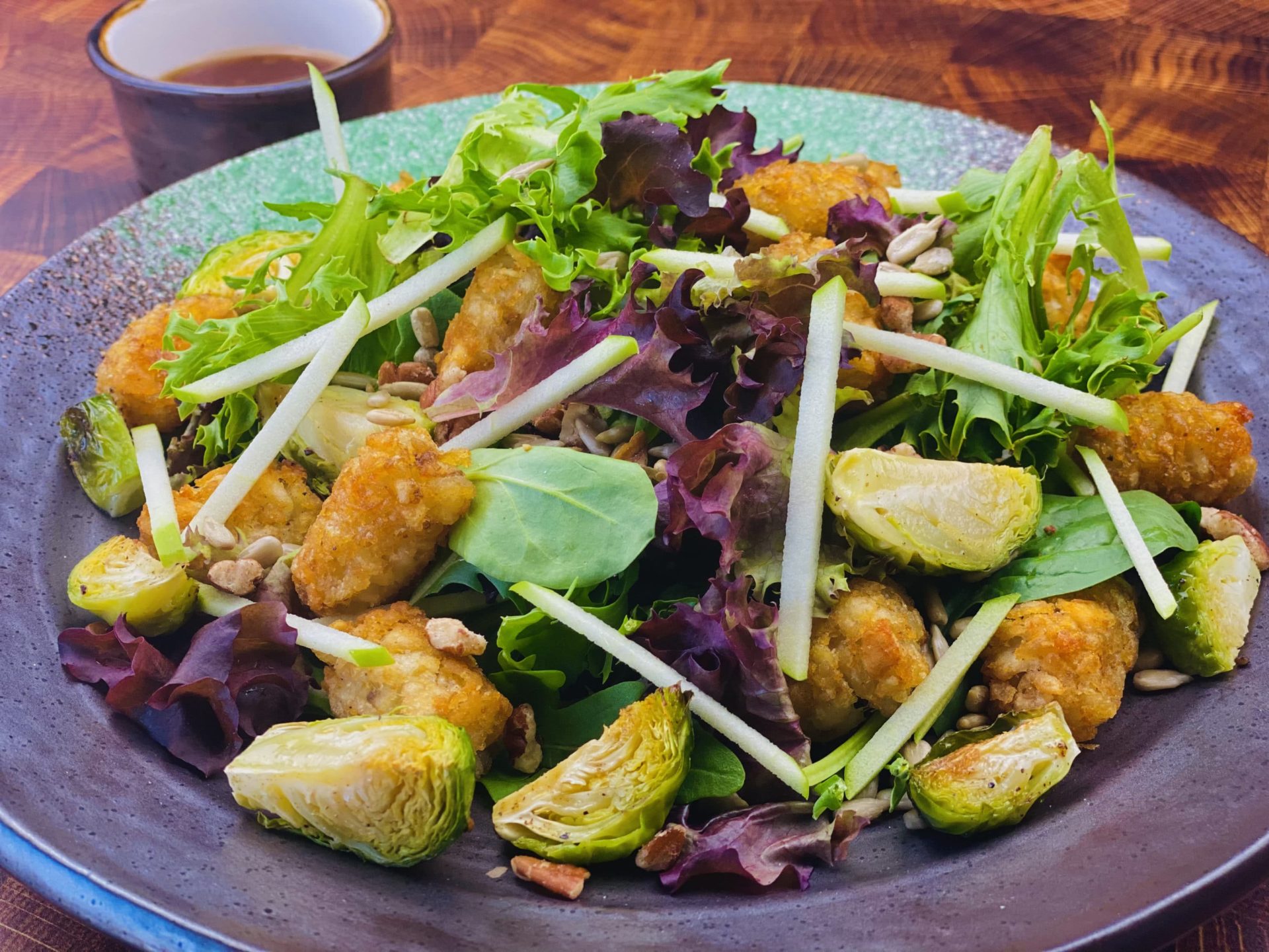 5. To assemble the salad, place 1-1/2 cups of mixed greens down on each serving plate. Top with 4 ounces (120g) Roasted brussels sprouts followed by ¼ cup (30g) thinly sliced apples, 1 tablespoon (15g) of chopped pecans, 1 tablespoon (15g) sunflower seeds, and ½ cup (35g) of crispy tater drums. Drizzle 1-1/2 tablespoons (20ml) of the dressing over each salad and enjoy.