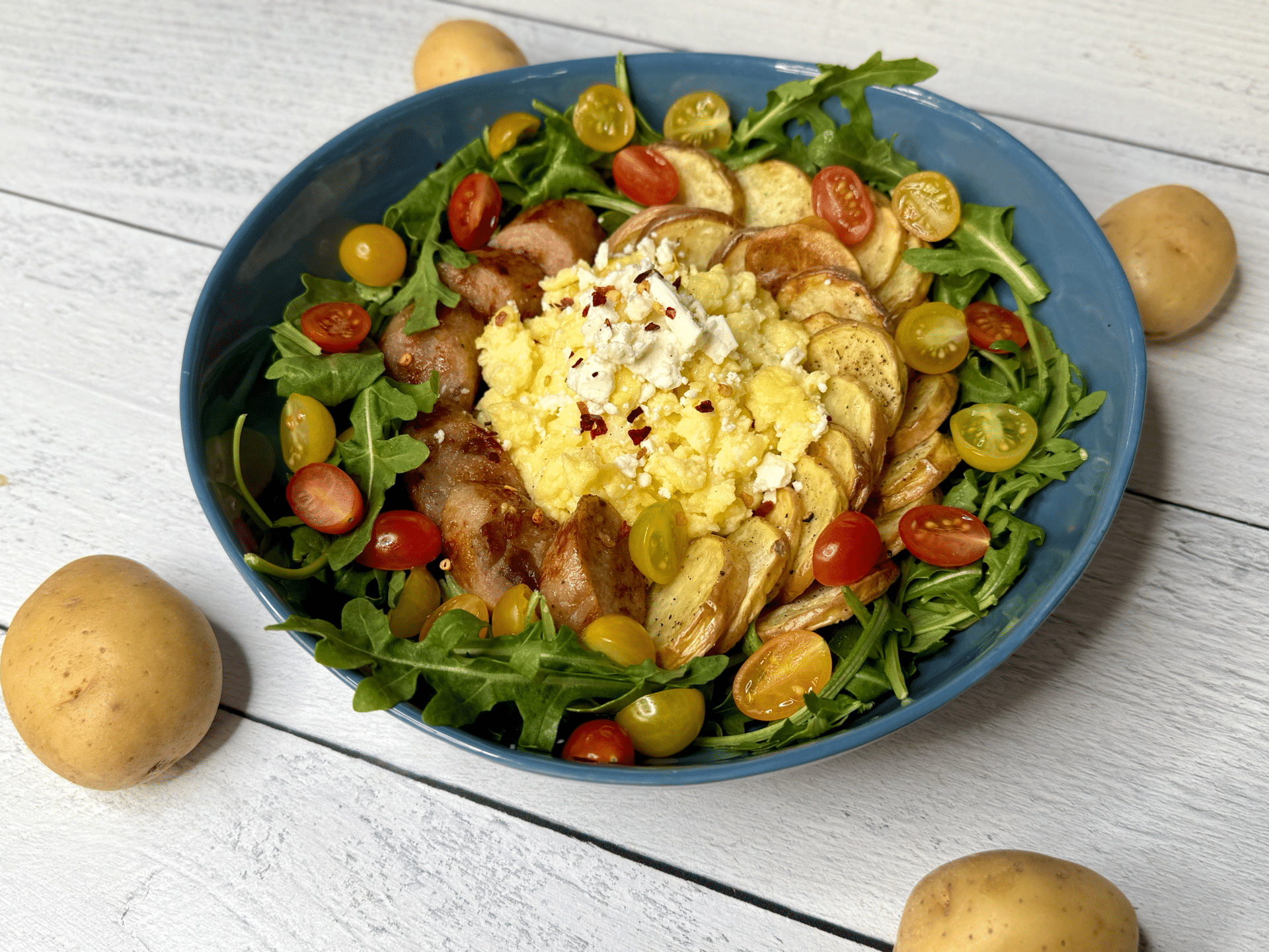 6. Once the potatoes are finished cooking, build your breakfast bowl starting with arugula, then the potatoes, sausage, cottage cheese-egg scramble, and tomatoes. Top with feta and chili flakes. Enjoy!
