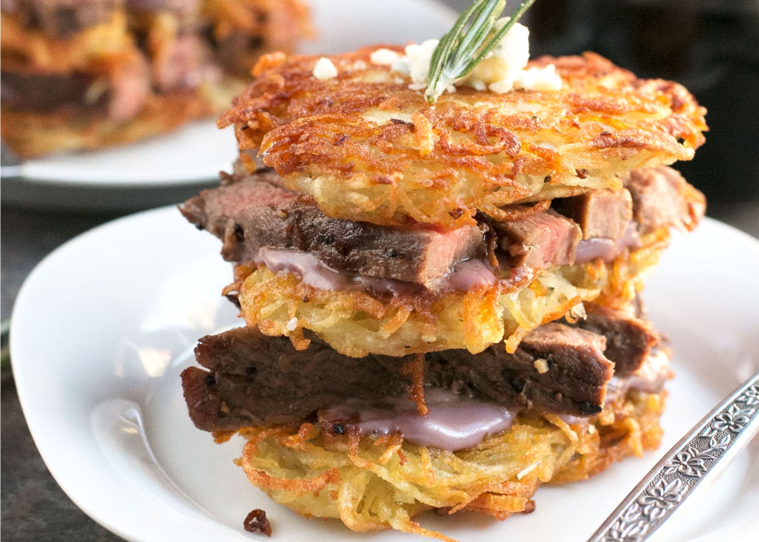 6. To create the stacks, begin with a potato pancake. Add a couple slices of steak and drizzle with sauce. Repeat these layers once, finishing with a potato pancake, a drizzle of sauce and garnish with chopped chives.