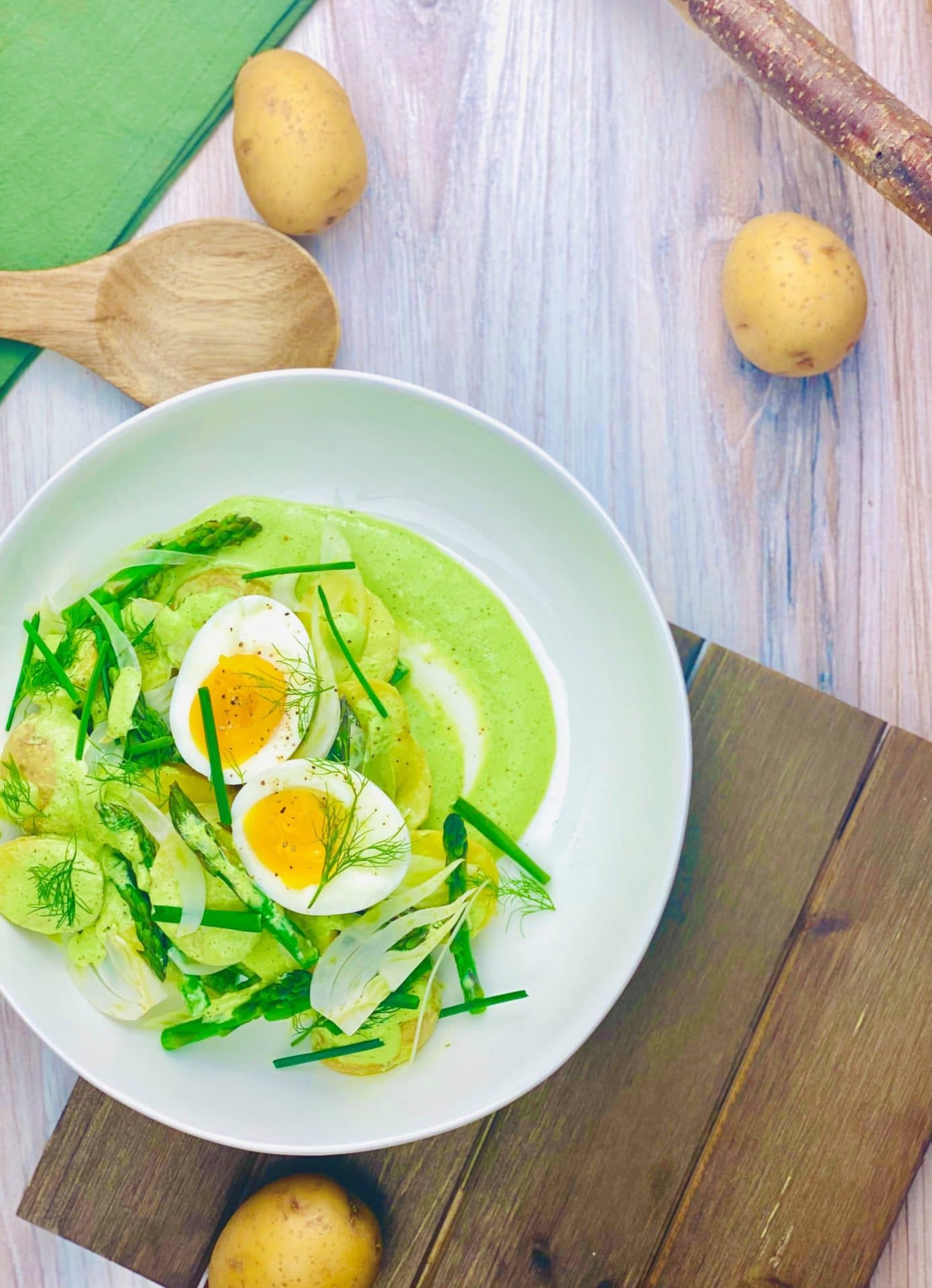 4. To plate up toss the potatoes and asparagus in half of the dressing. Arrange the dressed vegetables on a serving plate and arrange some of the sliced fennel on top of the dressed veggies, lightly drizzle some of the remaining dressing on top, and garnish with the egg slices and fresh chives.