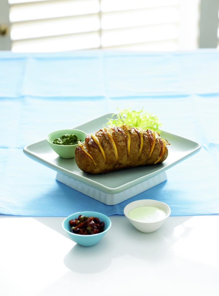 1. Cut each potato across its width into ½-inch thick slices, stopping ½-inch before the bottom so that the slices are still joined at the base.