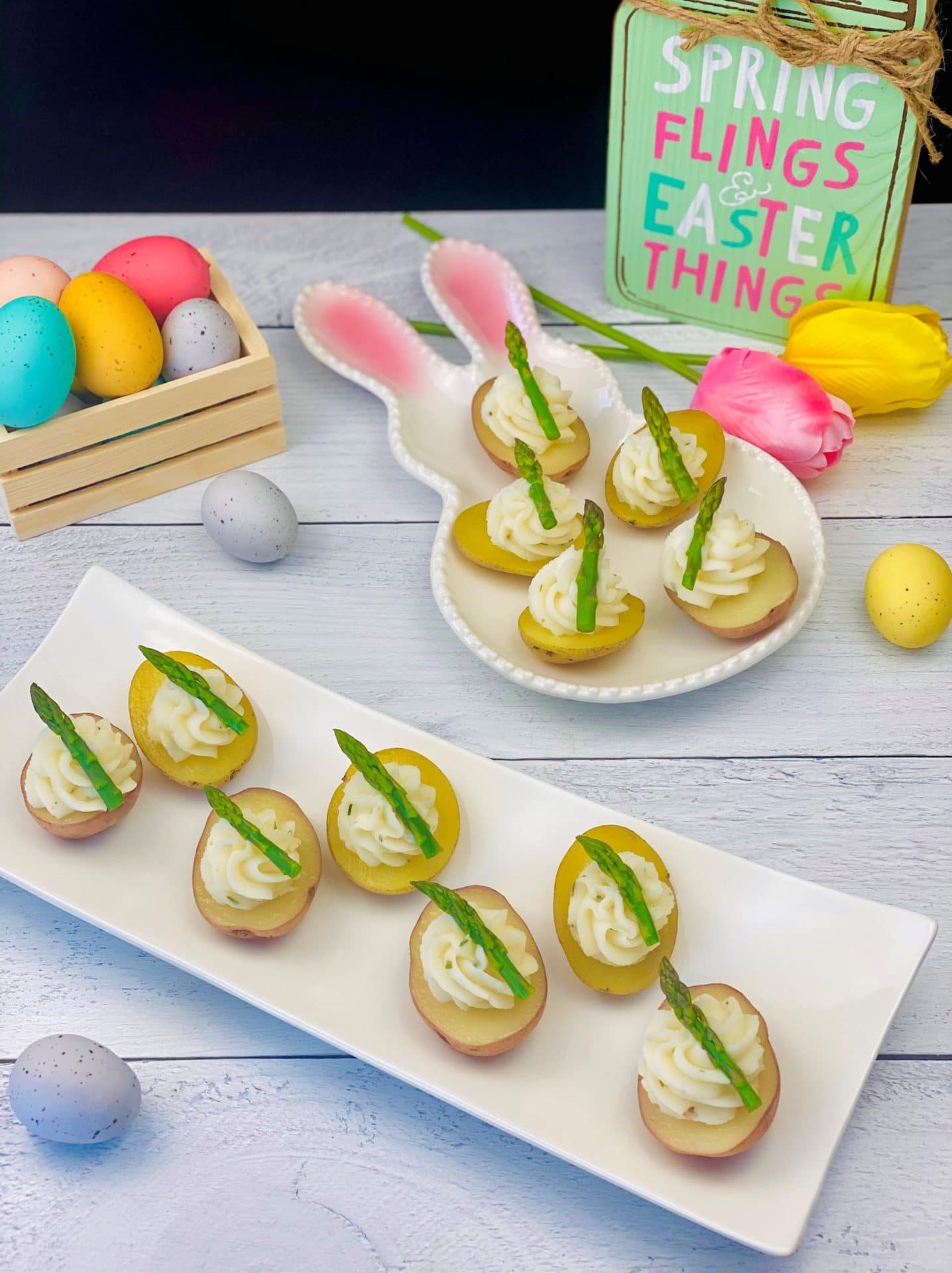 Note: These deviled potatoes pair perfectly with asparagus, but they can be garnished with other toppings such as sundried tomatoes, smoked salmon, radish slices, fresh herbs, tiny pickles, chilies, etc. Enjoy!