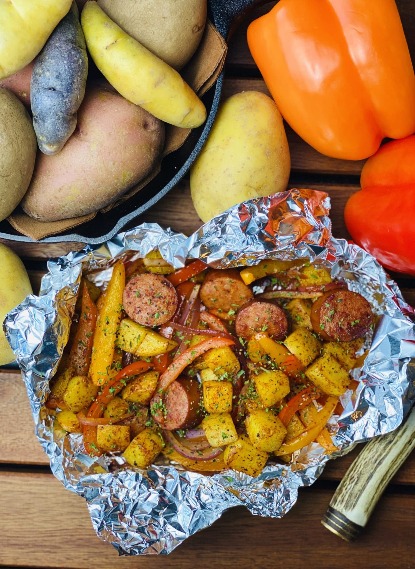 2. Place the potatoes and peppers onto a large square of aluminum foil.