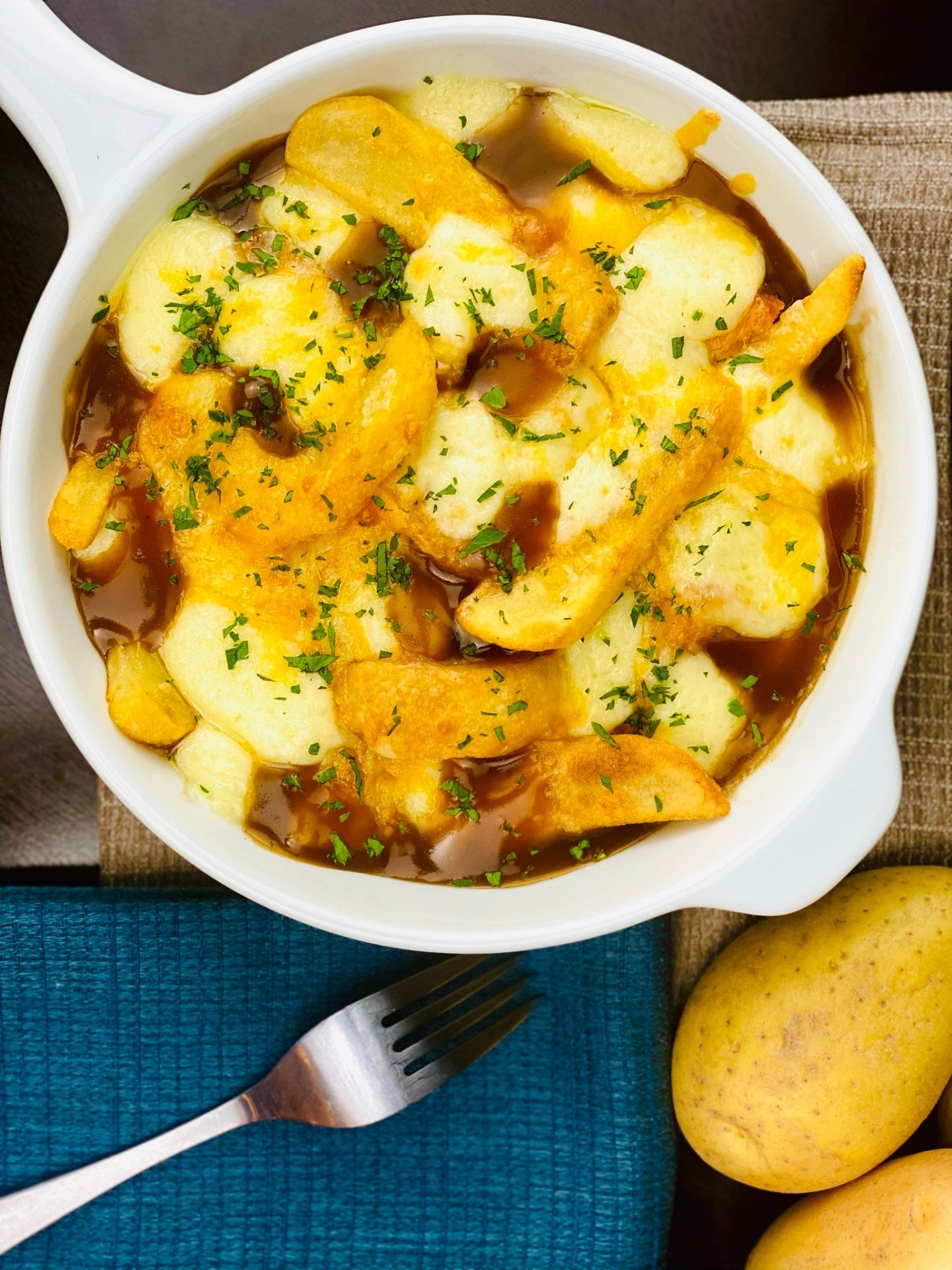 3. Cover the fries in the gravy and top with the shredded cheese. Place the fries under a broiler until the cheese is melted and just beginning to get brown in spots.  Remove from the oven and garnish with the chopped herbs.  Serve immediately. Enjoy!