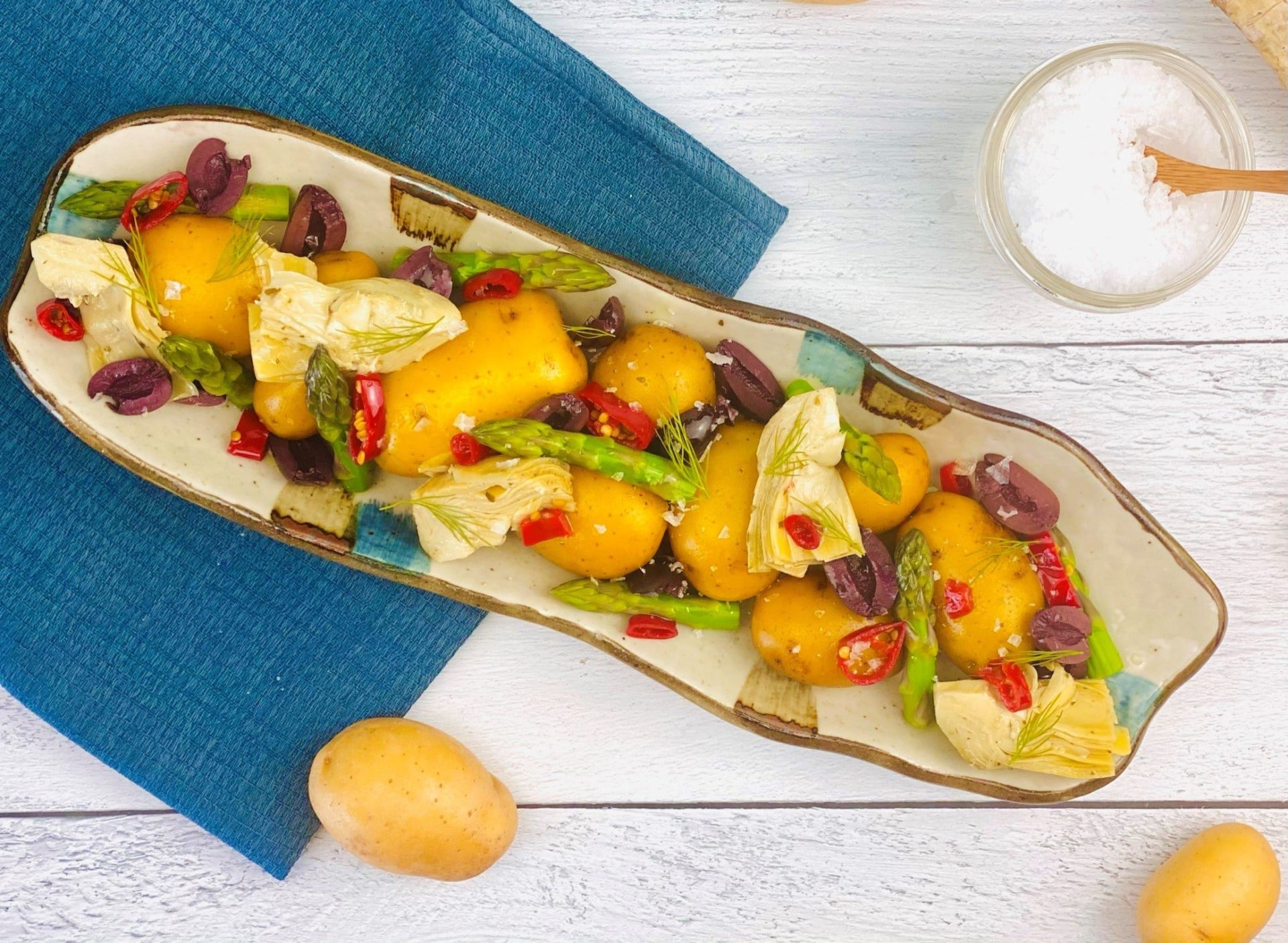 6. To plate up, arrange the potatoes on a serving plate or dish. Place some of the asparagus, artichoke hearts and olives around and on the potatoes. Garnish the top with some sliced Calabrian chilies, and spoon some of the reserved vinaigrette on top.