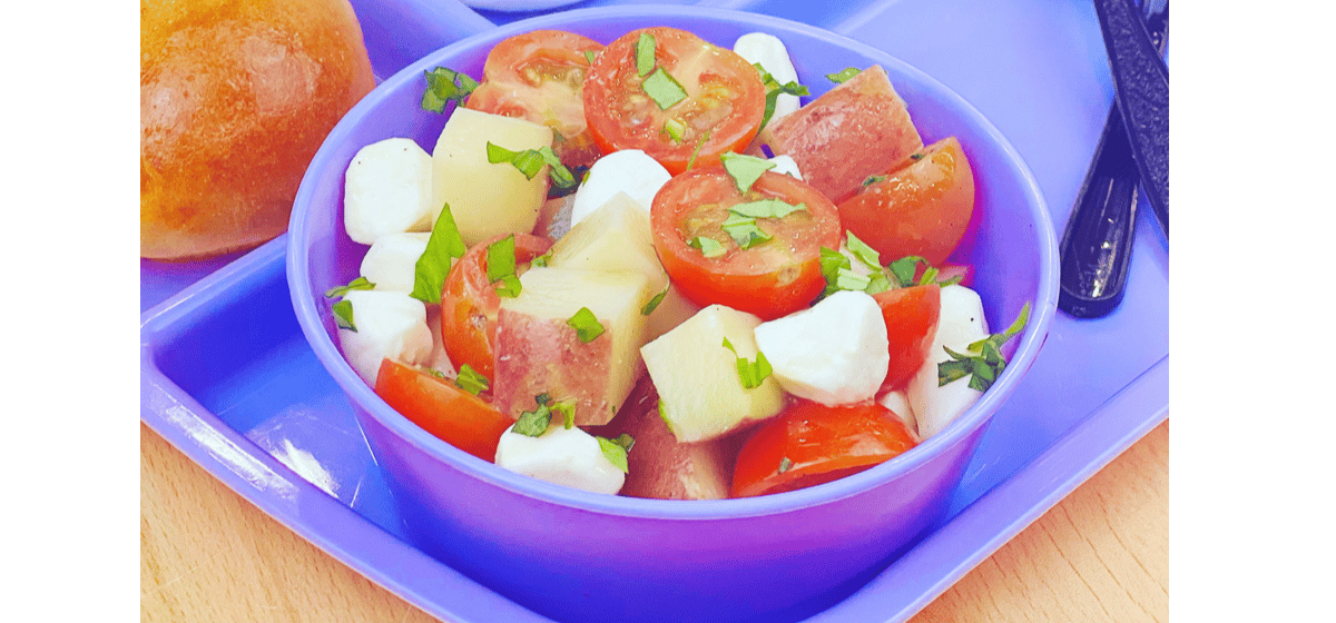 Potatoes meet Caprese! Light red potatoes, juicy cherry tomatoes, silky stringy mozzarella pearls and fresh vibrant sweet basil tossed in a tangy red wine vinaigrette.