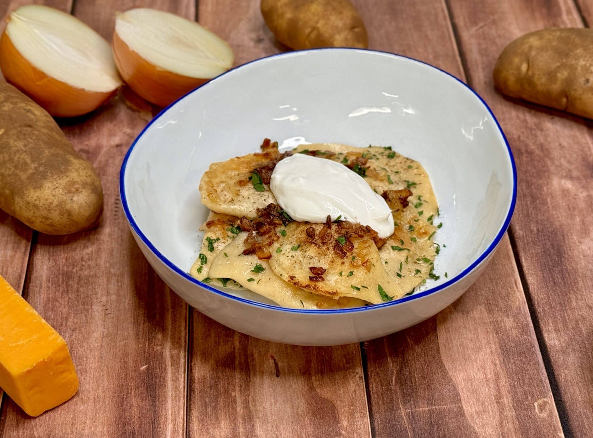 These homemade potato pierogi are stuffed with a silky mash of tender potatoes blended with onions that are slowly sautéed in butter until they’re sweet and velvety, plus a generous handful of shredded cheddar for a creamy, savory finish. Each dumpling is hand-filled, boiled until pillowy, then finished in a hot pan for that irresistible buttery crisp on the outside.