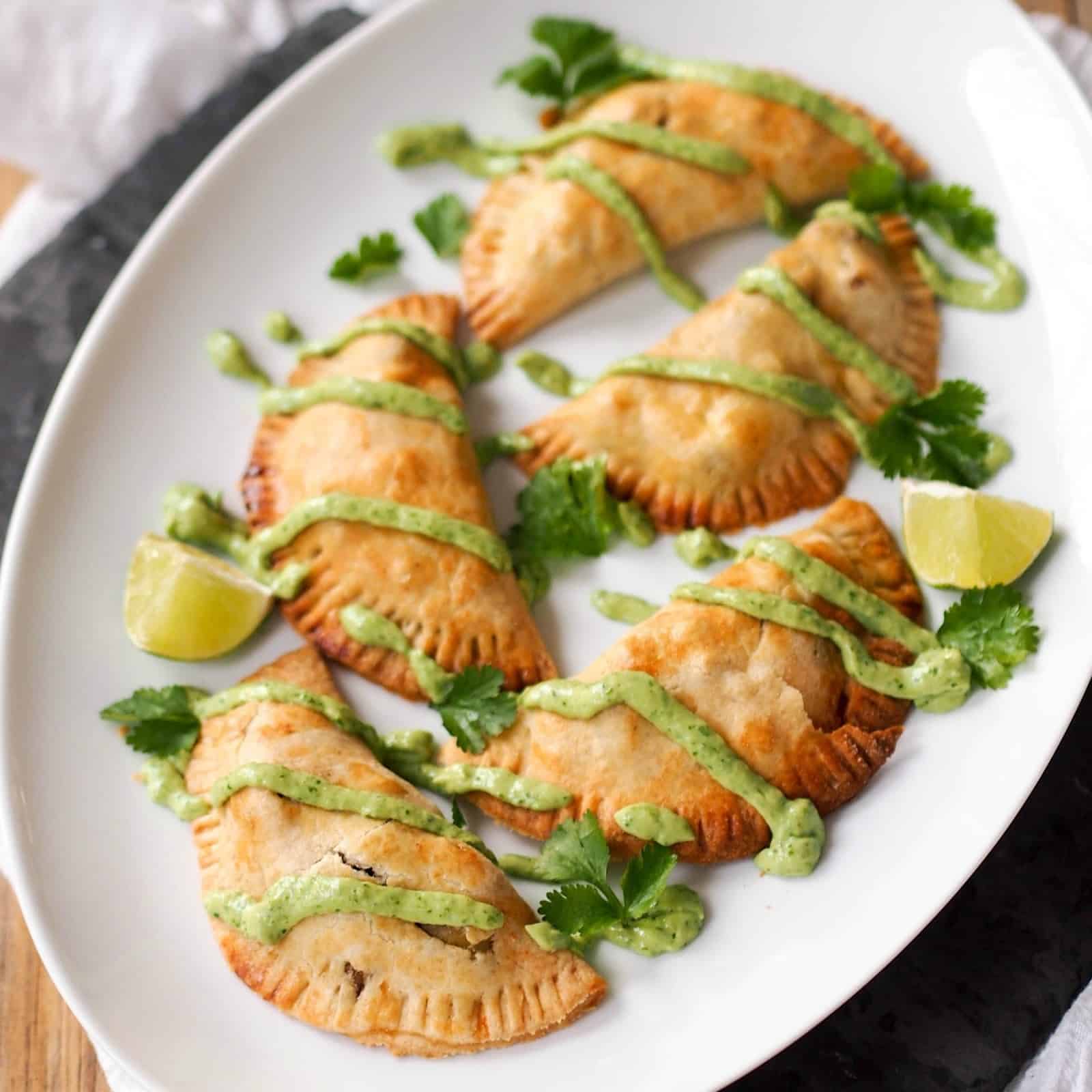6. While empanadas are cooking, blend avocado, cilantro, garlic and lime juice in a food processor. Season with salt to taste.