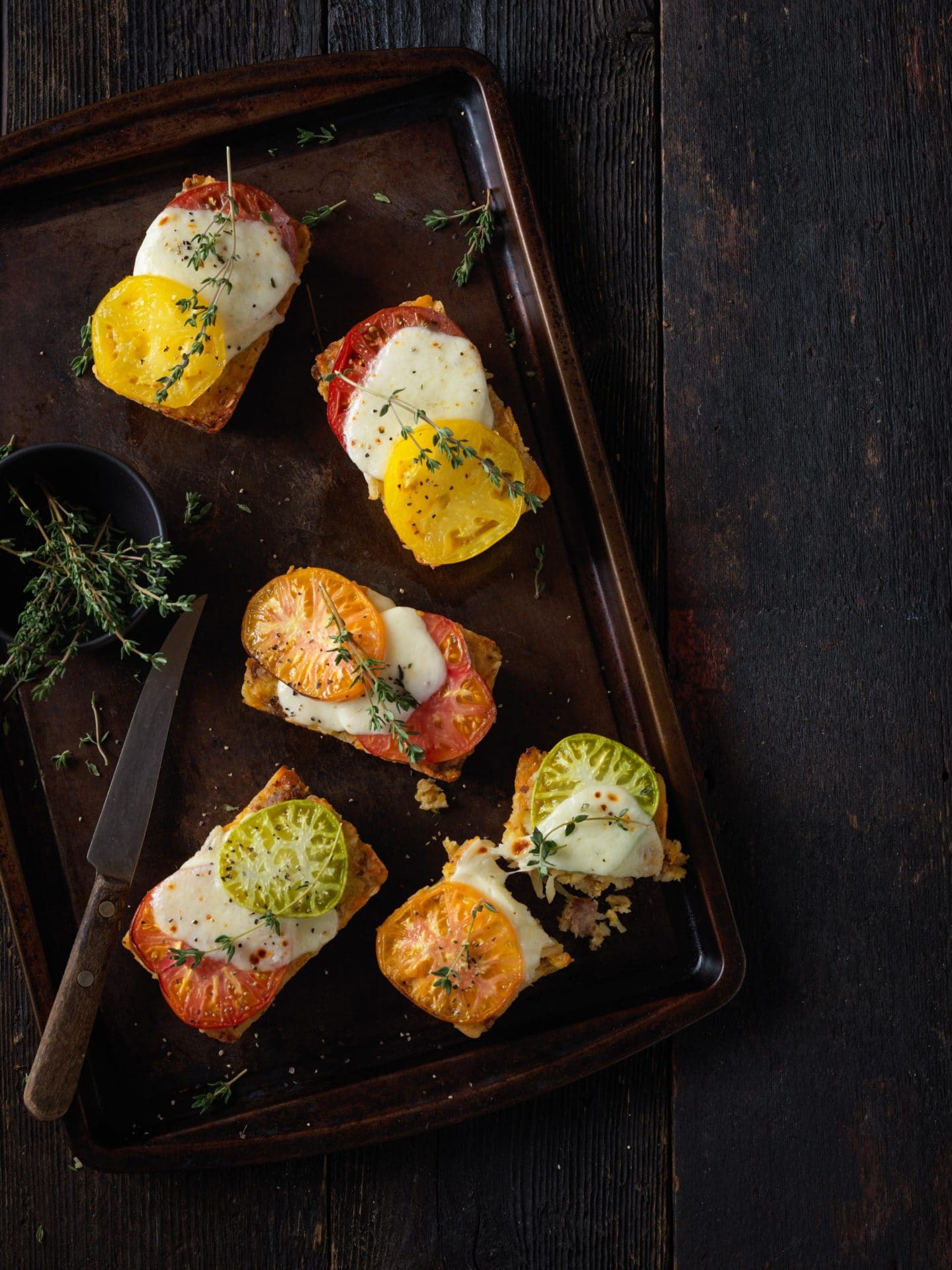 6. Take out bars and cut into 2 ¼” x 2 ¼” portion sizes. Place the bars on a lined sheet pan and add to each a slice of tomato and mozzarella on top. Broil for 5-6 minutes or until the mozzarella has melted. Garnish with a chive sprig.
