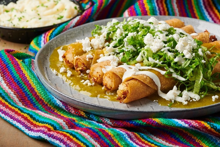 6. Serve flautas in the salsa verde, and top with lettuce, sour cream, and cheese.