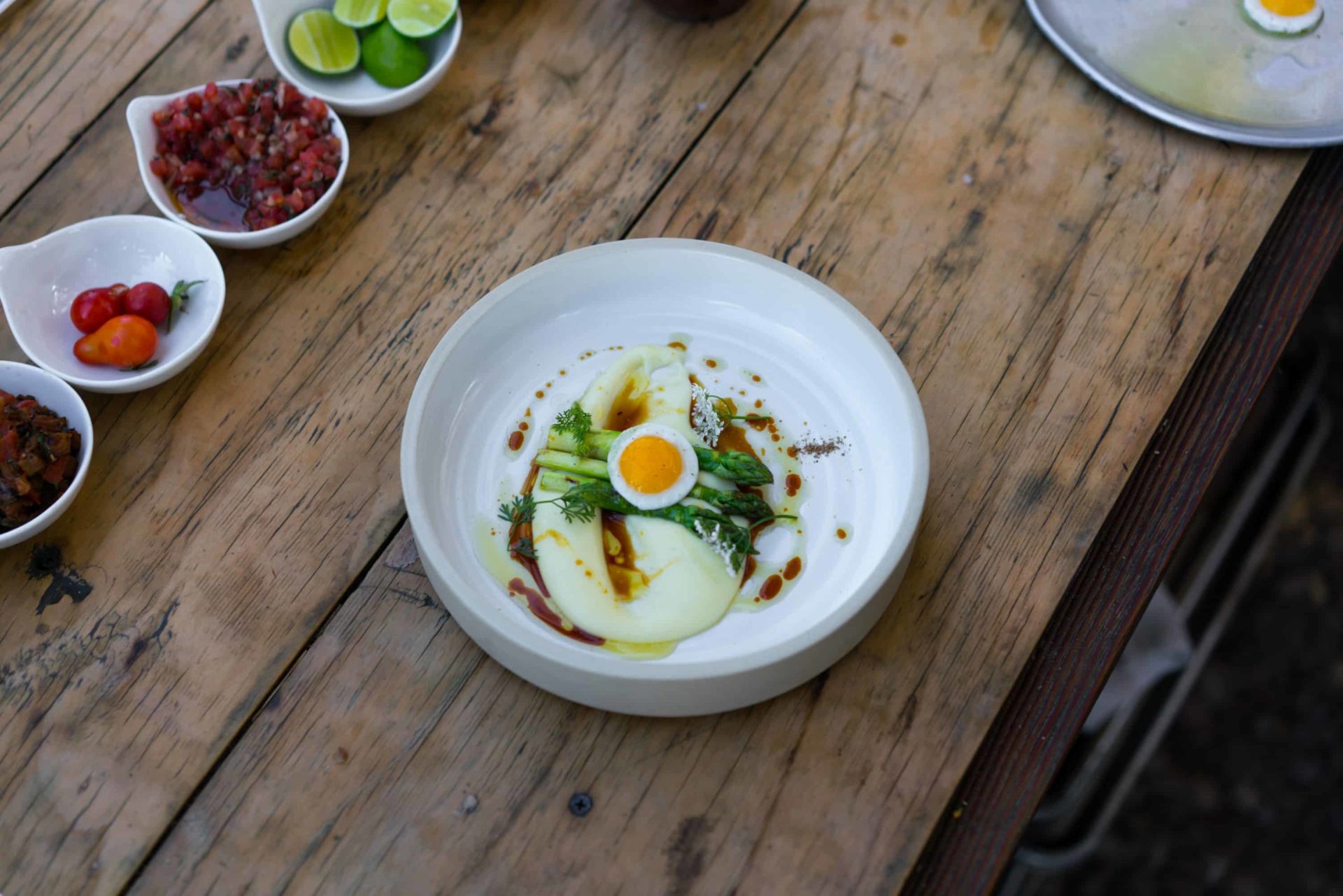 7. To plate- a spoon of potato puree, 3 pieces sauteed asparagus, one quail egg and spoon of veal stock reduction