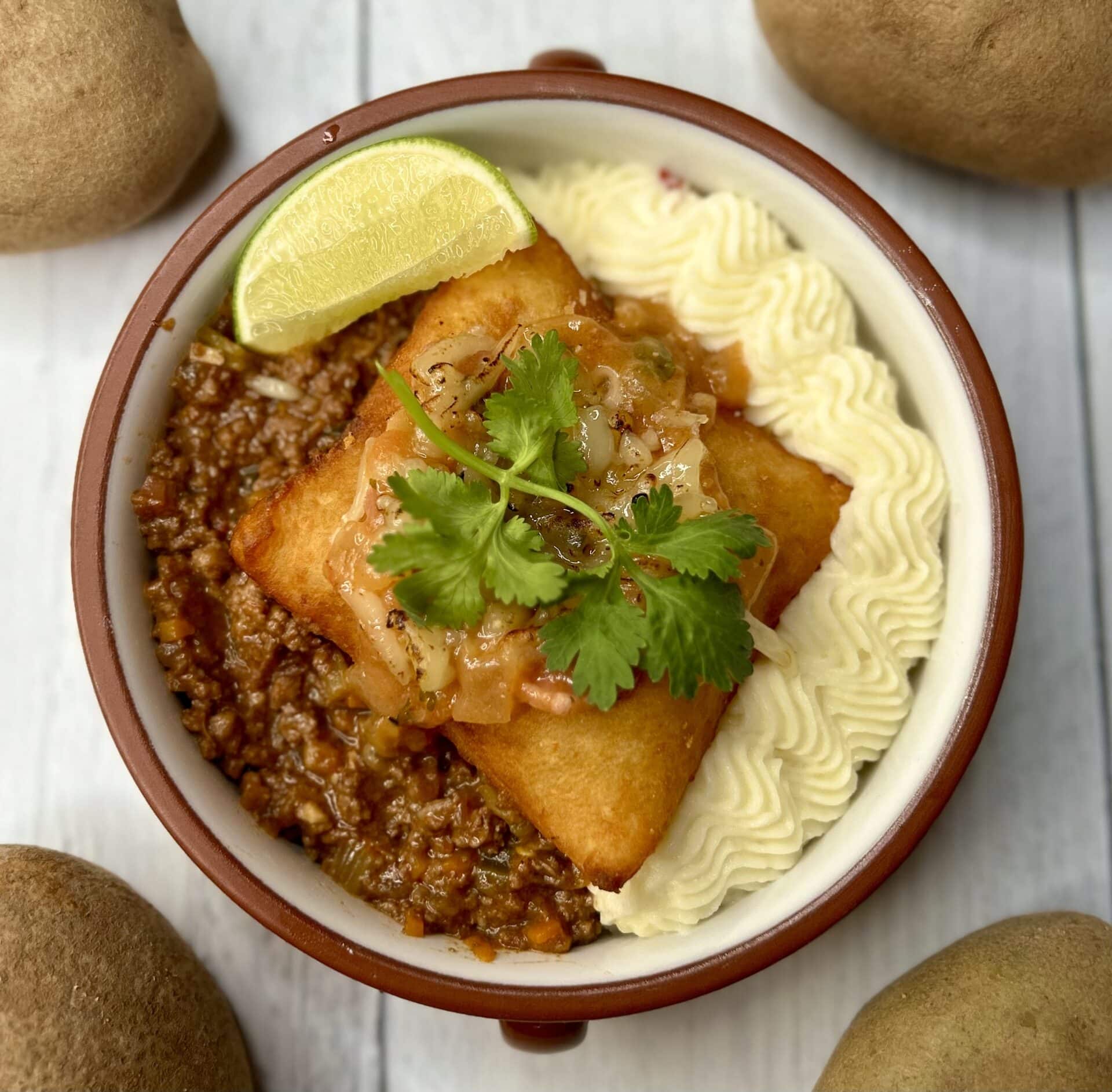 10. To assemble the dish, portion mashed potatoes and the Bolognese in the bottom of the serving dish. Top with the sopaipillas, a ladle of the green chili, and a sprinkle of pepper jack cheese. Serve immediately.