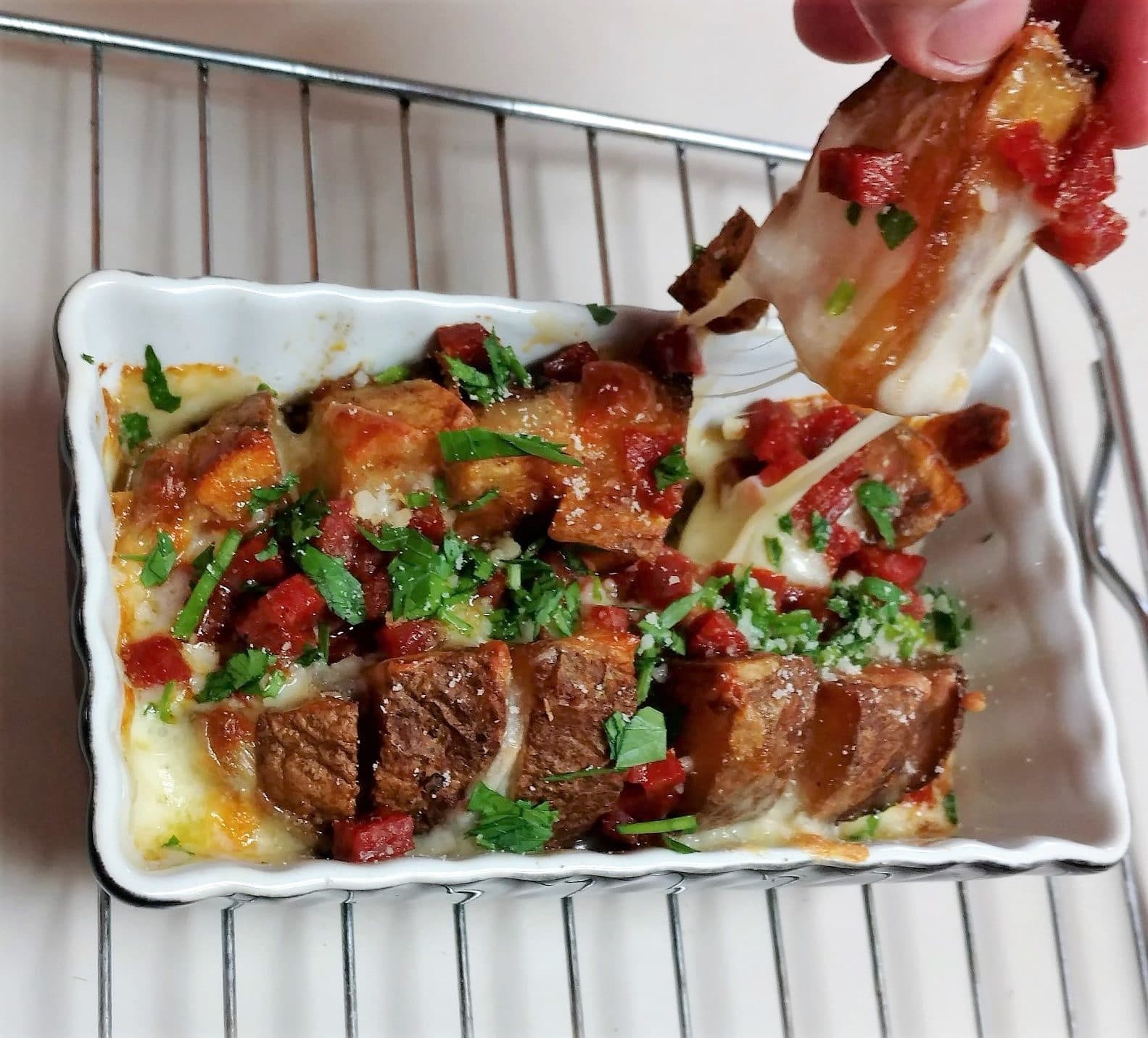A crispy and cheesy russet potato baked with gooey melted cheese, pepperoni, and fresh herbs. The perfect pull apart, shareable appetizer.