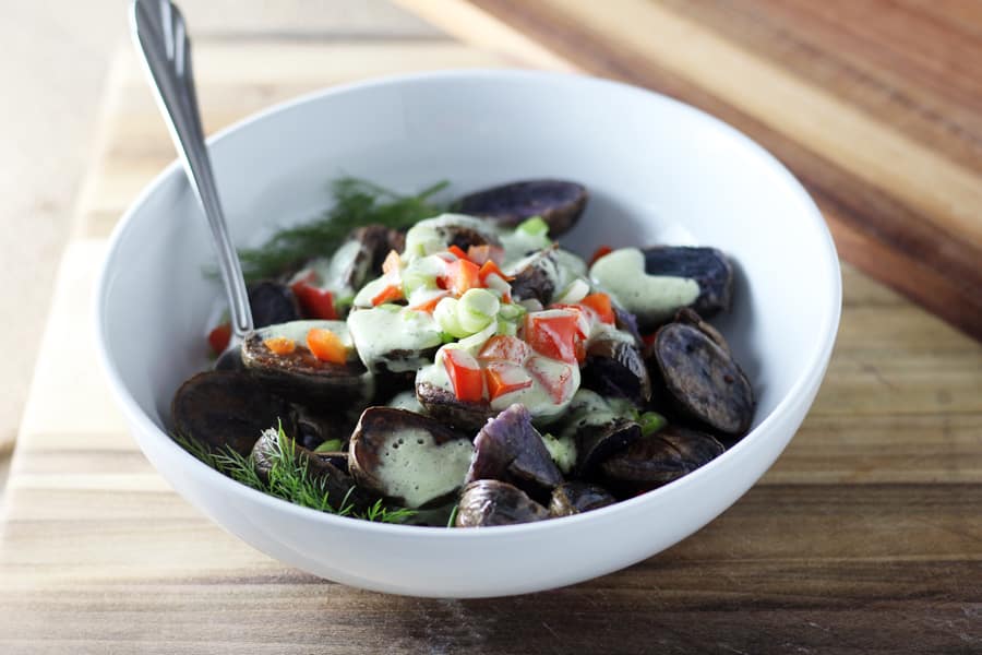 3. Serve the purple potatoes warm with a helping of Greek yogurt + dill dressing and sprinkle with onions and peppers.