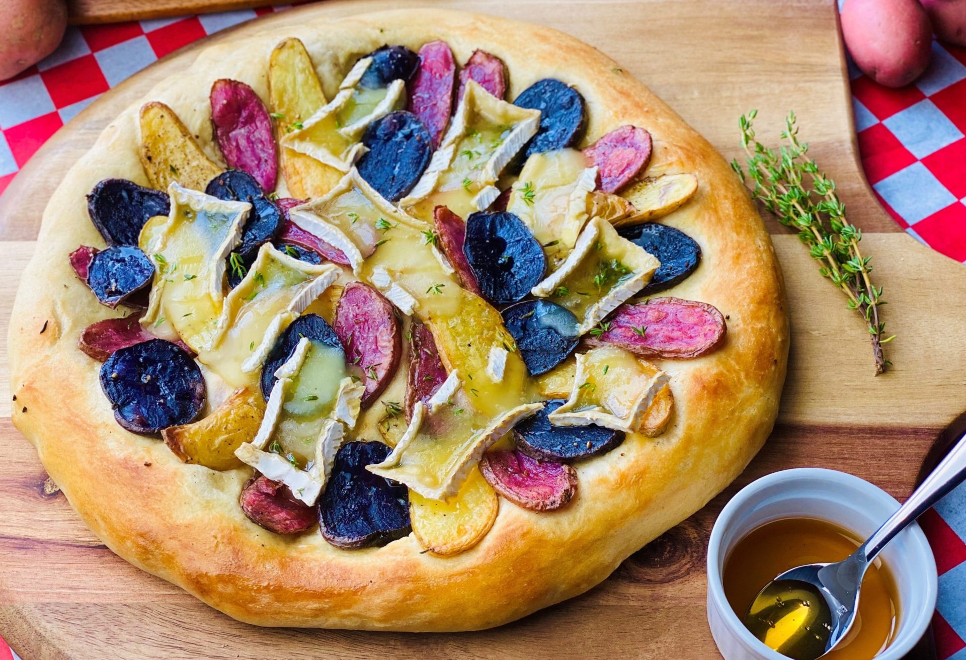 Roasted sliced fingerling potatoes, triple cream Brie, honey, fresh thyme, and sea salt.