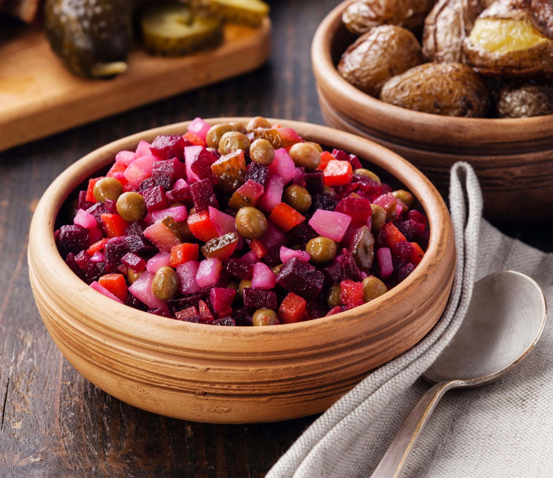 5. Boil the red beets for 25 minutes, then peel and dice the beets to 1/4″ (same as the potatoes and carrots). Add to the dressing and stir.
