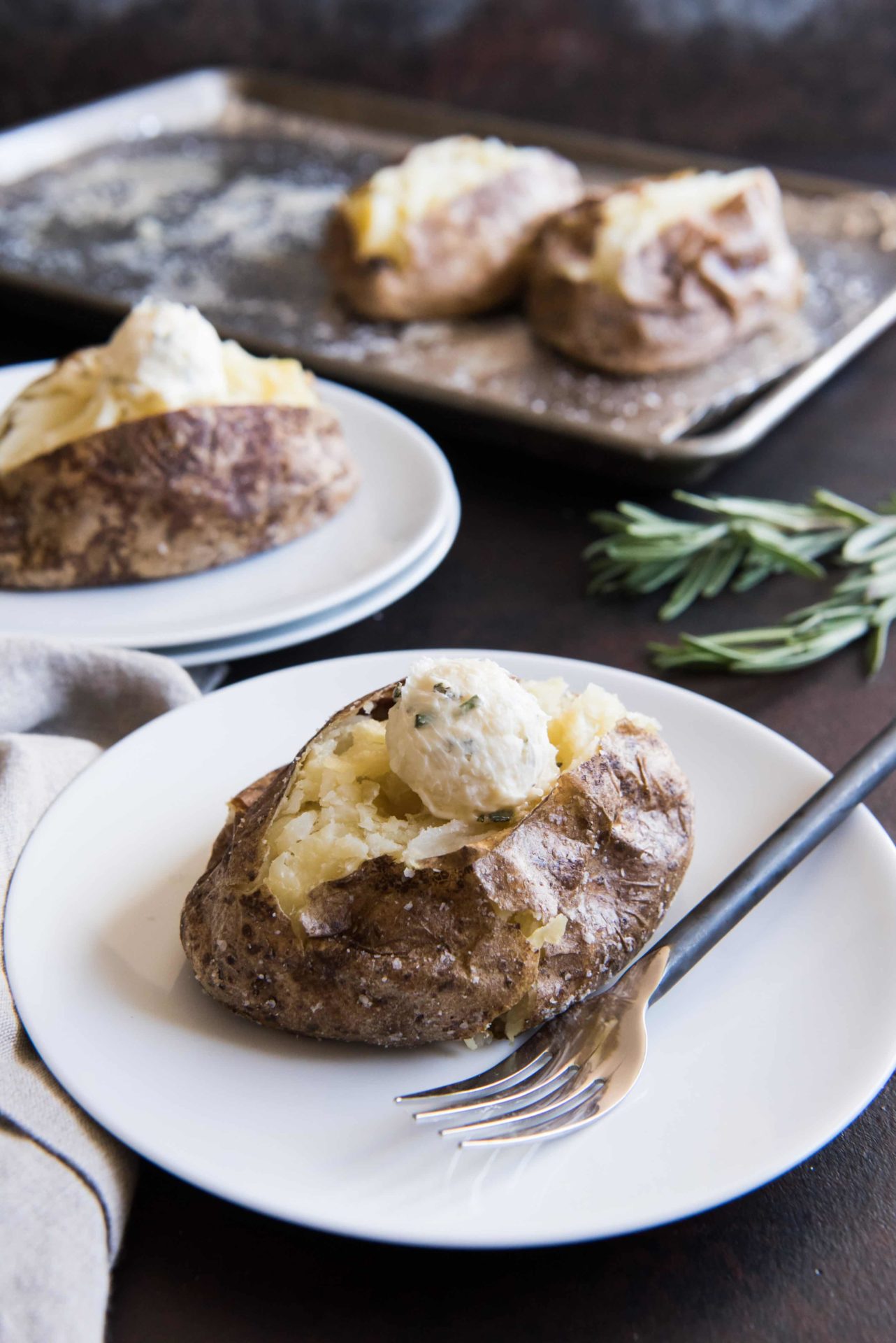 These salt crusted baked potatoes with roasted garlic & rosemary butter are anything but basic. Simple and easy, yes! But elevated too, thanks to a couple of baking tricks and an amazing compound butter that melts all over the fluffy insides of a perfectly baked russet potato!