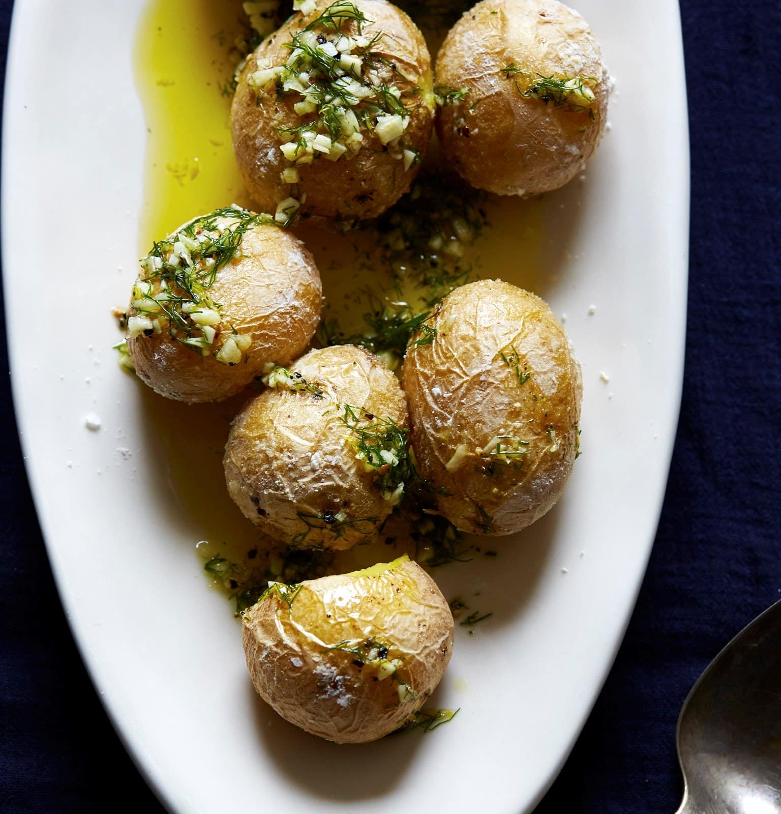 Add intrigue to your dinner party menu with the perfect skin of salt crusted potatoes flavored with garlic, herbs, and fennel.