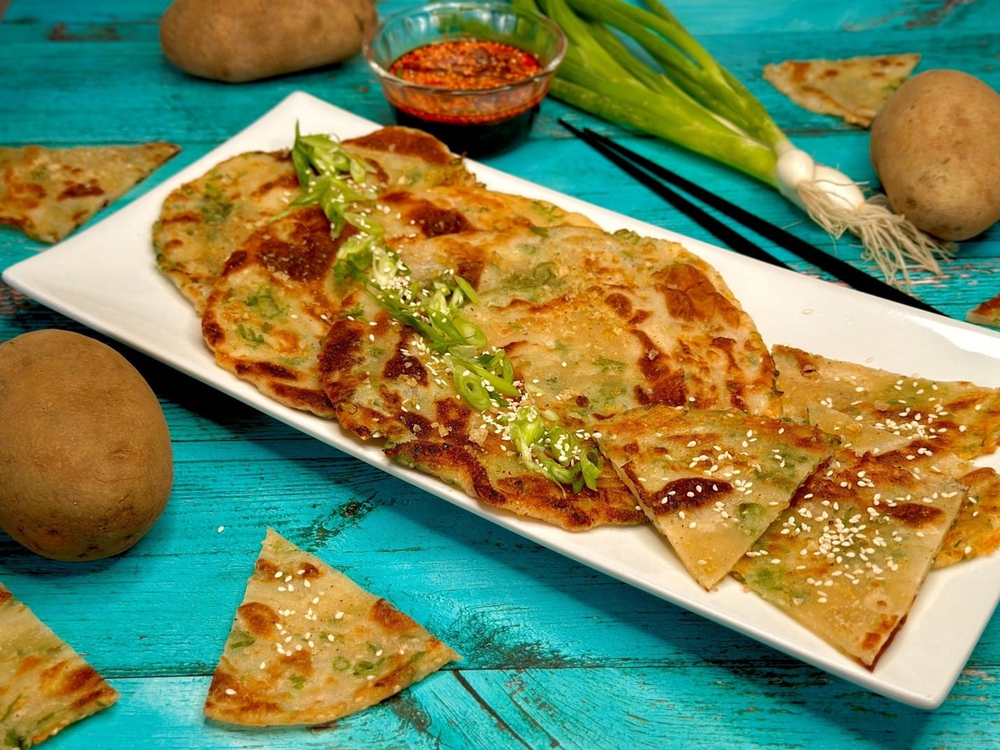 Mashed potatoes provide a unique twist to this scallion pancake. This results in a soft, tender interior while still achieving the classic crispiness on the outside. Bursting with fresh scallions, each bite offers a blend of flavors and textures for a delightful, savory treat.