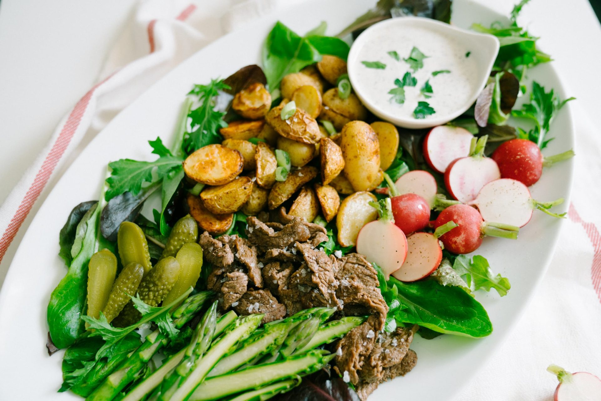 2. Add potatoes, steak and veggies in separate piles over greens. Top with spring onion and parsley.