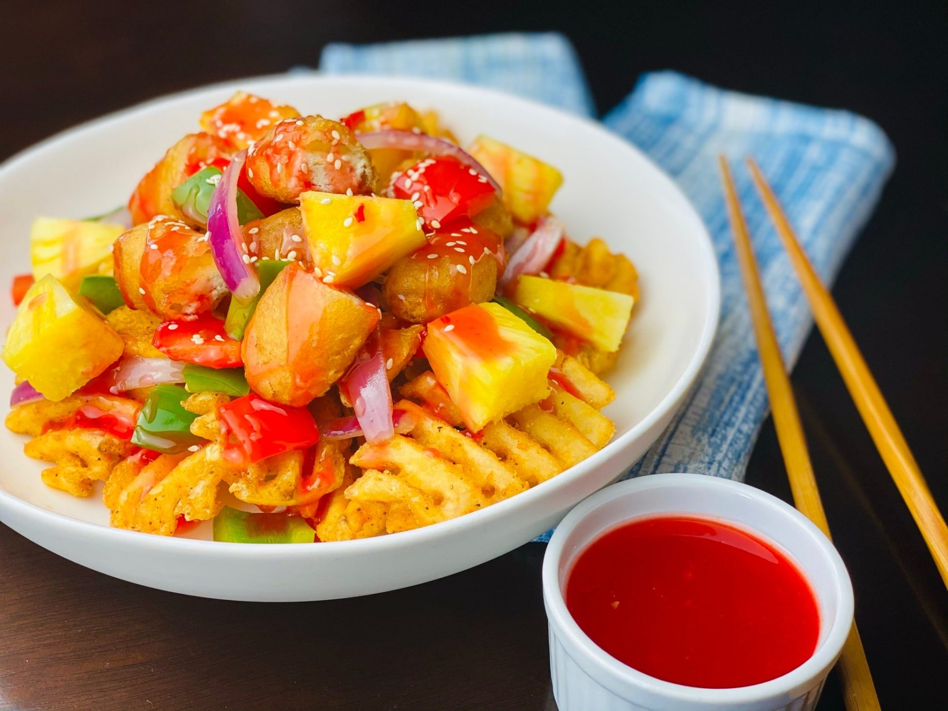 5. Top the fries with the stir-fried vegetables and pineapple, and the crispy pieces of chicken. Ladle the sweet and sour sauce over the chicken and vegetables and garnish with the sesame seeds. Serve immediately. Enjoy!