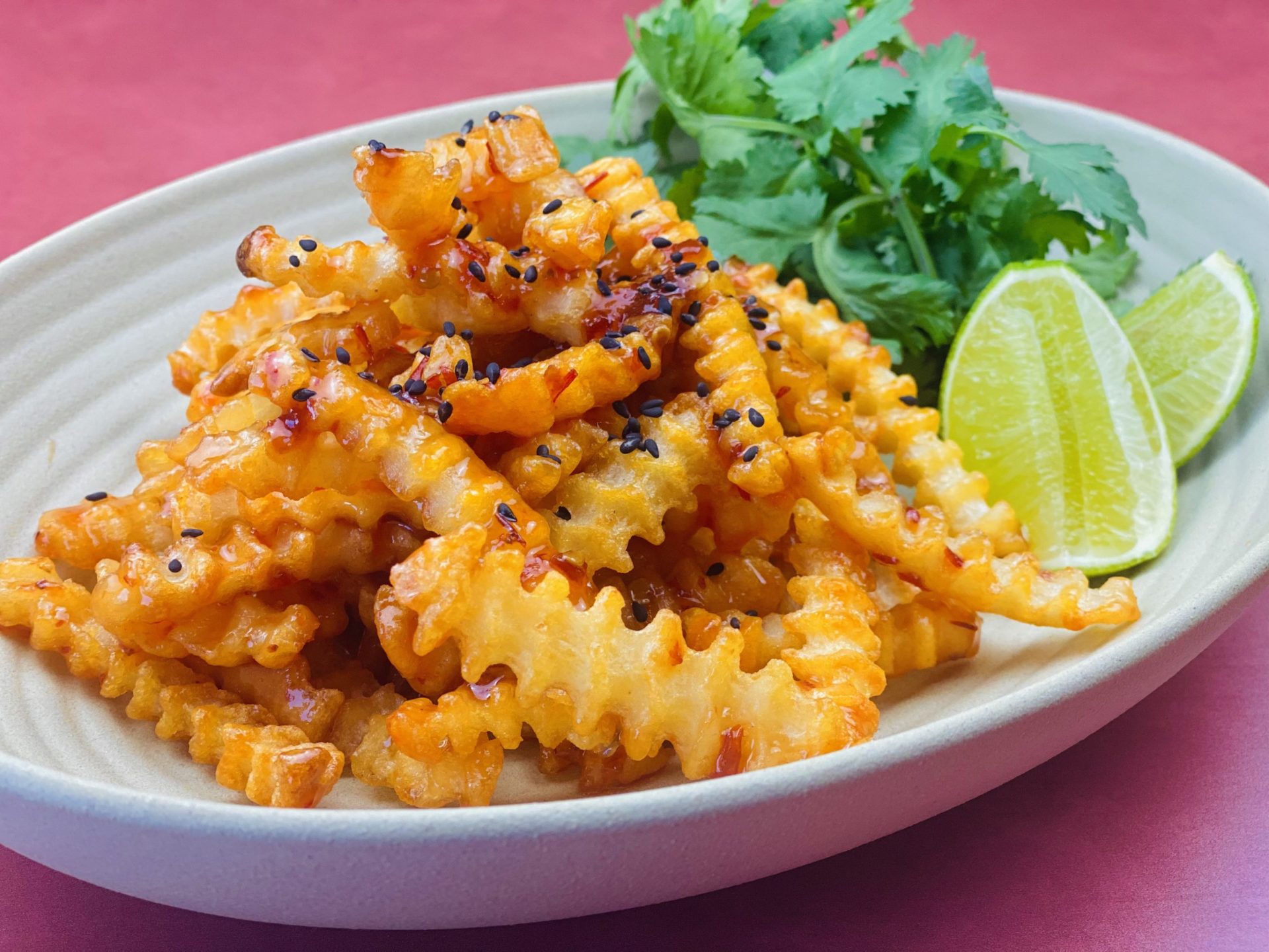 7. Pile the fries on a serving platter and garnish them with the sesame seeds, fresh lime wedges, and cilantro. Enjoy while hot.