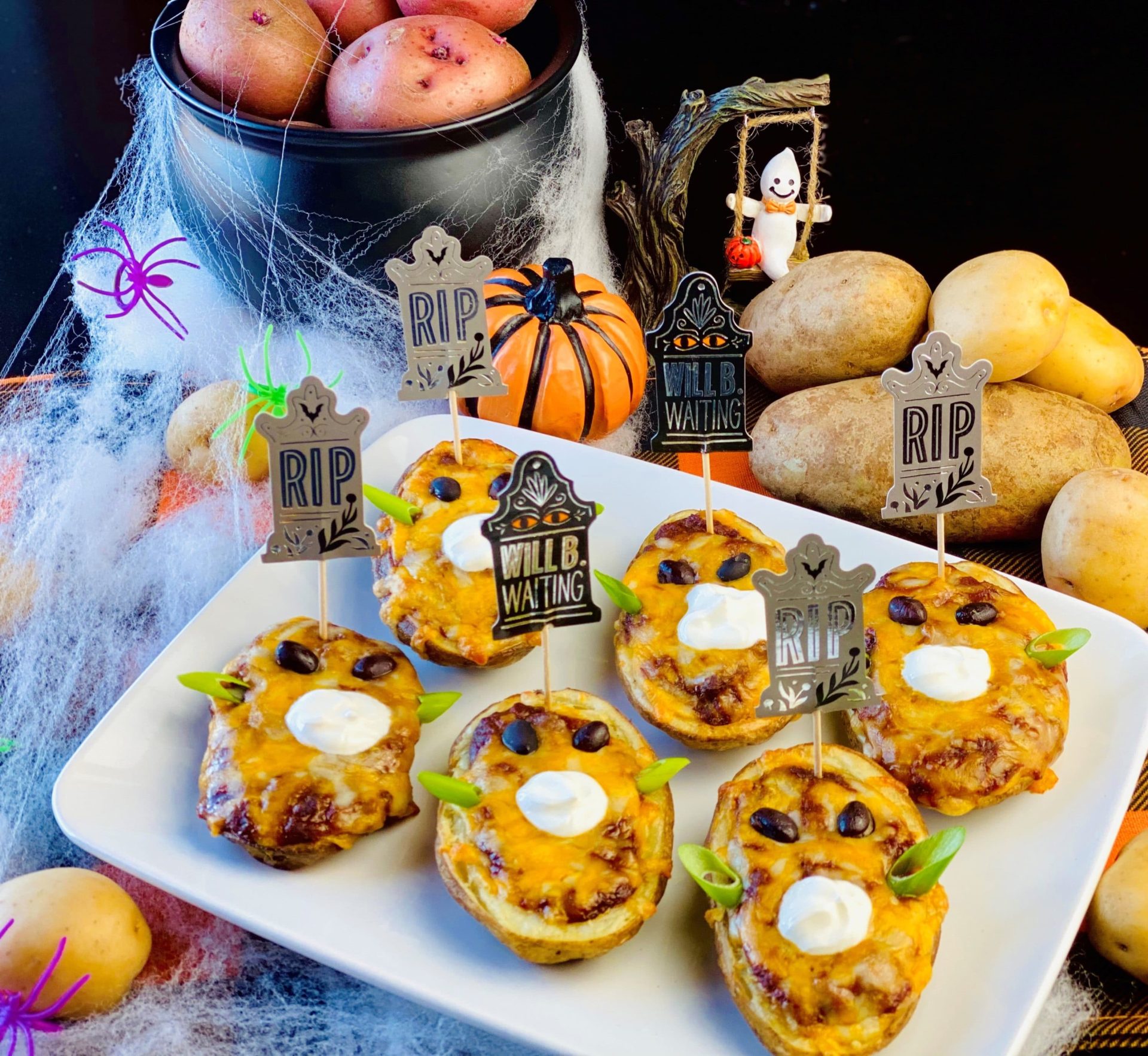 9. Remove the tater shells from the oven and garnish with black beans, green onions, and sour cream to make spooky ghosts.