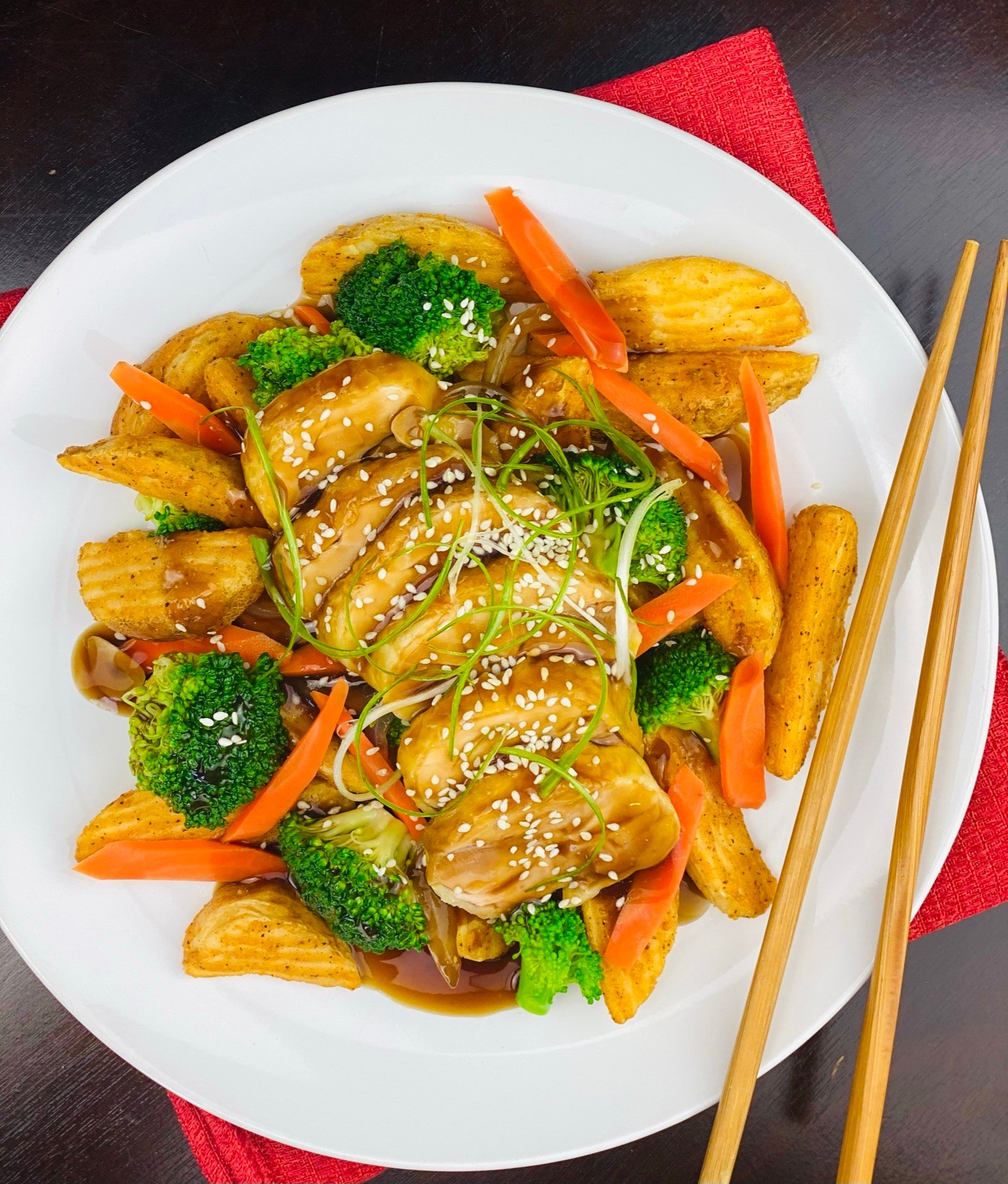 6. Top the wedges with the stir-fried vegetables, and the sliced pieces of chicken. Ladle the teriyaki sauce over the chicken and vegetables and garnish with the sesame seeds and green onions.  Serve immediately. Enjoy!