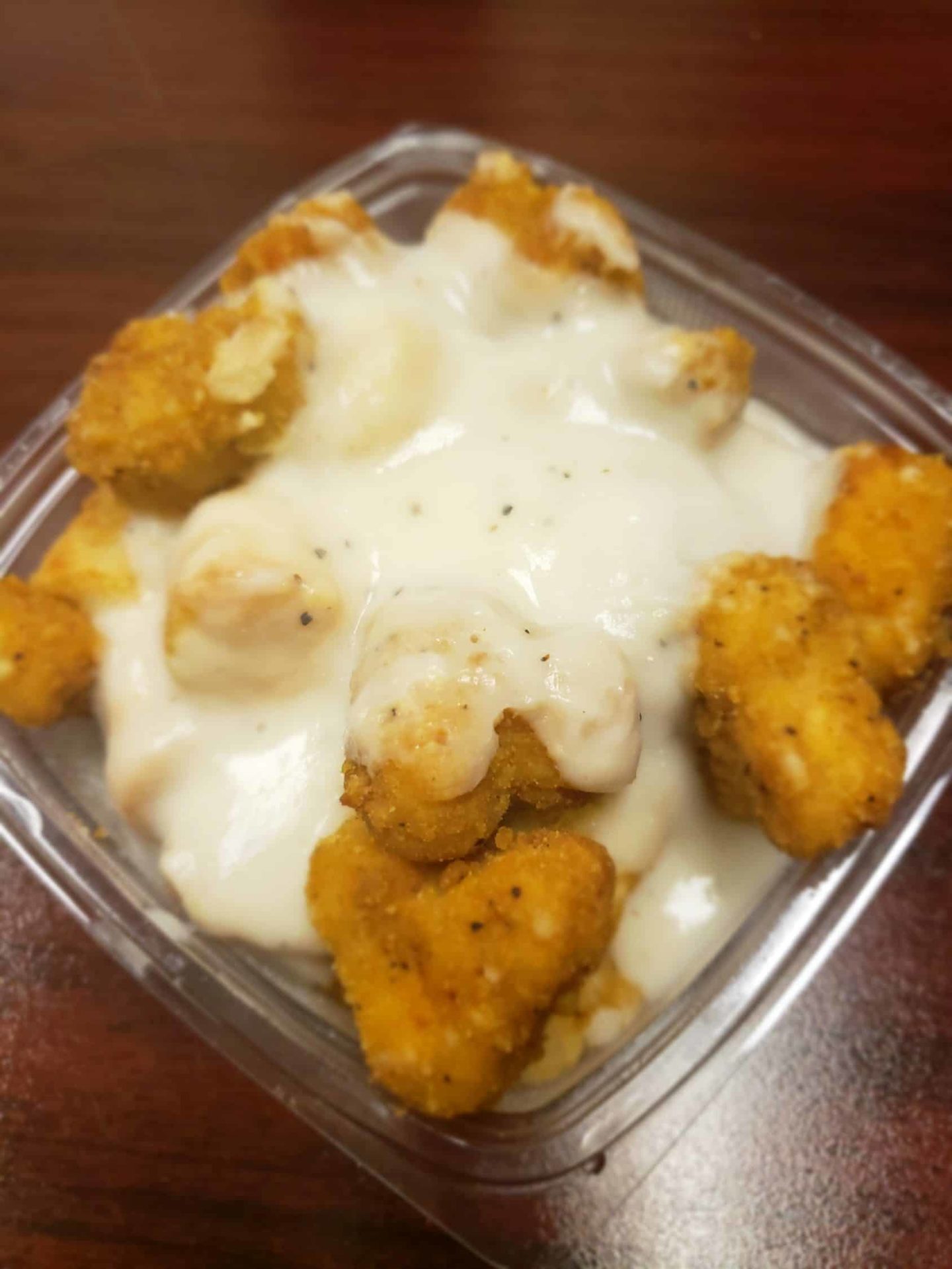 At time of service, place 2 and 2/3 oz (2.67 ounce) potato rounds in bowl (about 9 potato rounds).  Place 1 ounce scoop of eggs on top of potatoes (#30 scoop).  Then top with 5 chicken nuggets (3 oz).  Offer with 1/8 cup gravy.
