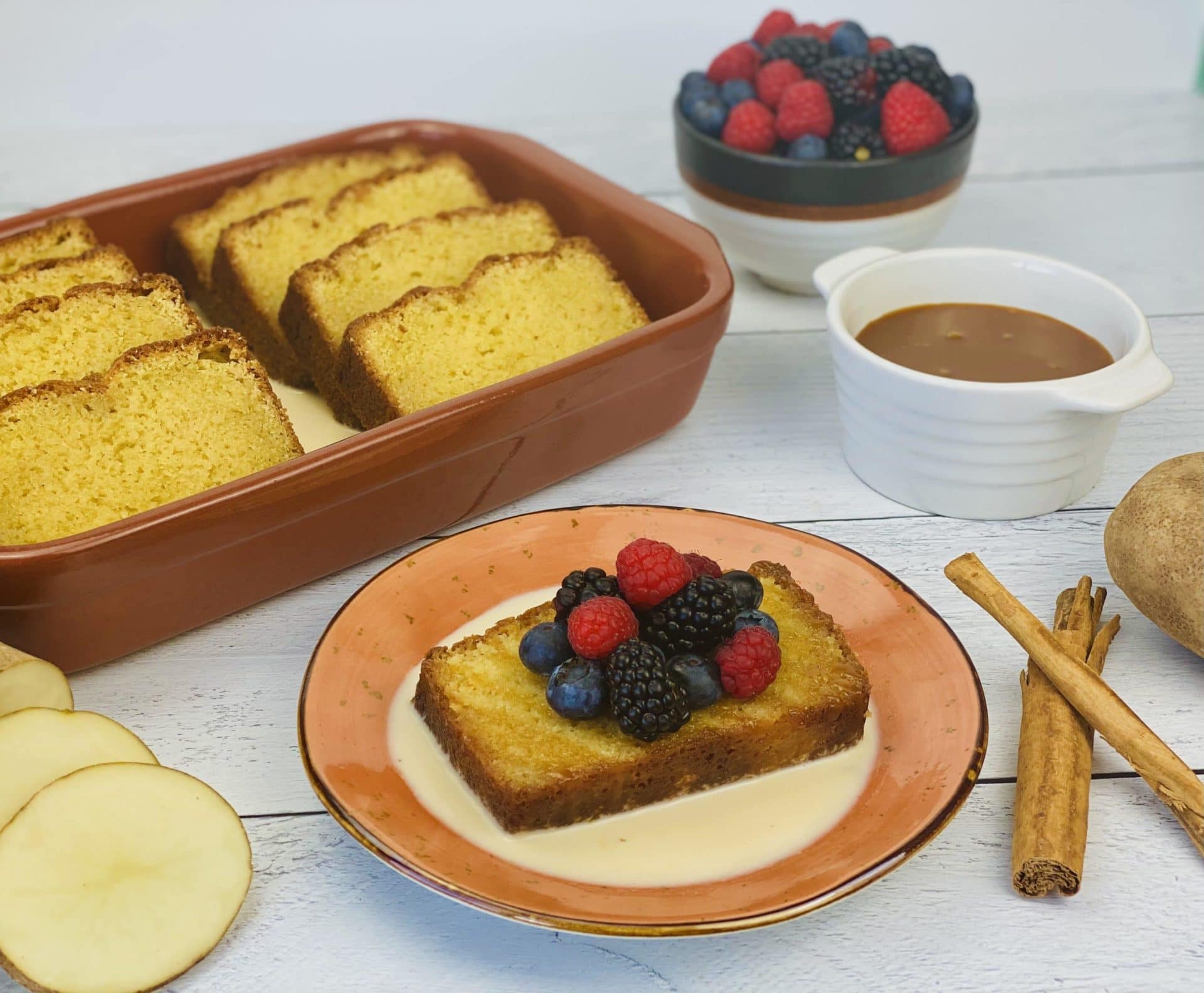 Rich and decadent potato pound cake soaked in sweetened milk then topped with fresh berries and sea salted caramel.