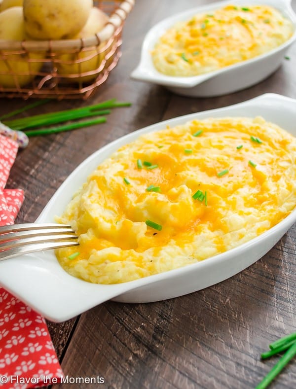 - Because the prepared mashed potatoes already have butter, milk, and garlic these steps do not need to be added. The recipe does need to be adjusted slightly for the cheese, rosemary and nonfat Greek yogurt. Only use 2/3 cup of cheddar cheese, 1/3 cup of Greek yogurt, and 2 teaspoons of chopped fresh rosemary.