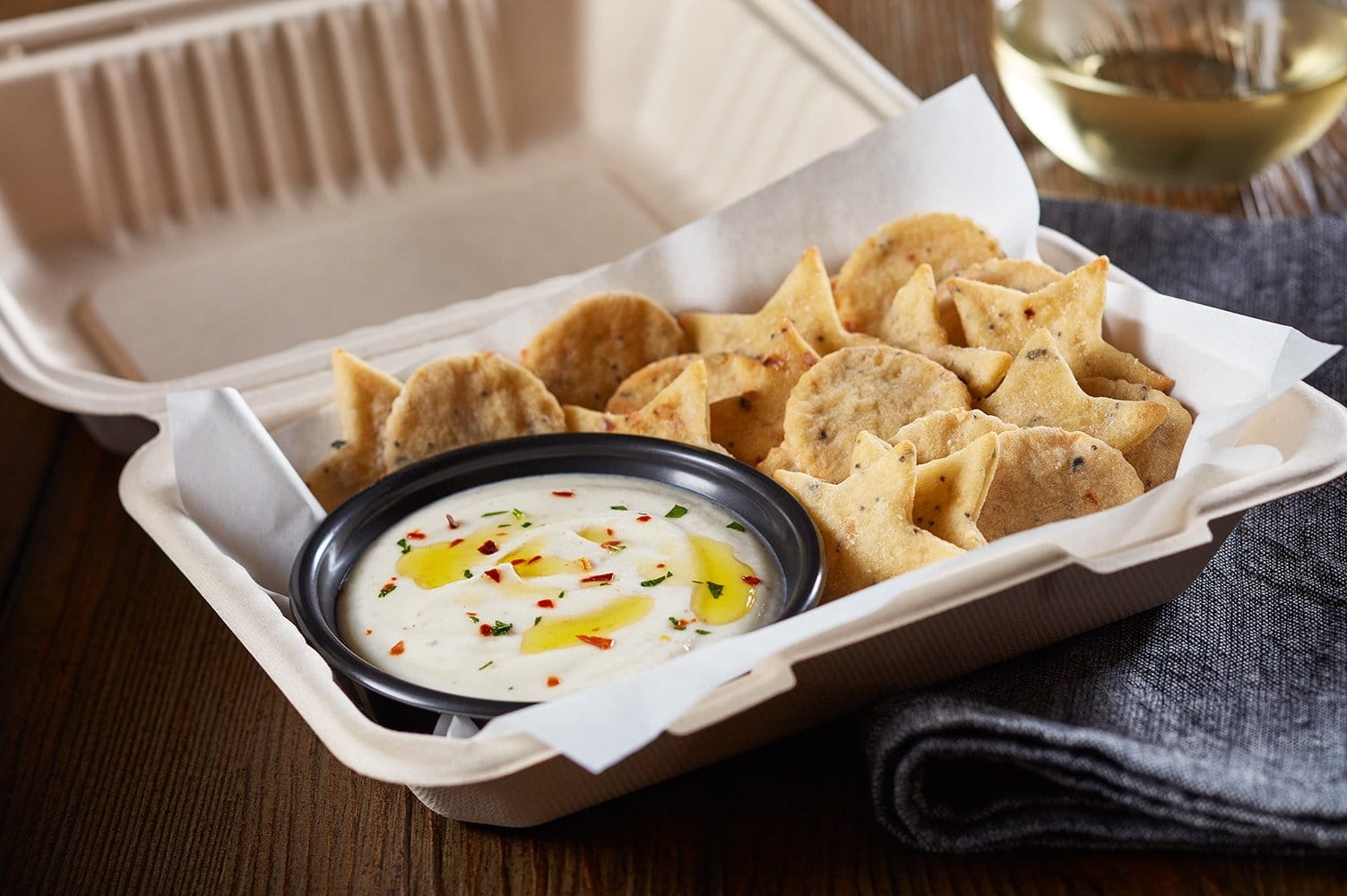 1. Portion 12 ounces dip into a serving bowl. Garnish with oil, parsley, and chili flakes. Arrange 12 crackers on a plate alongside the dip.