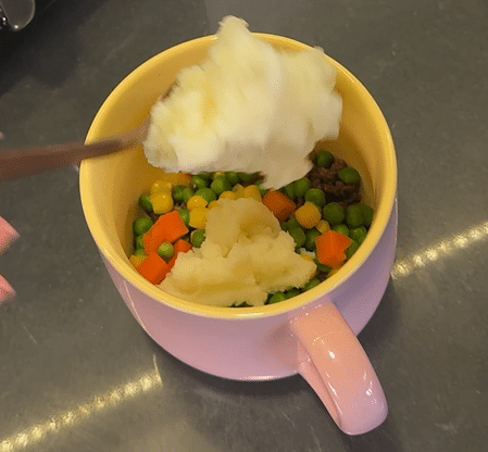 The cooked and seasoned beef, lamb, or turkey goes in the bottom of a large mug with a layer of frozen mixed vegetables (such as peas, carrots, and corn) on top. Heat these most of the way through, while preparing your instant mashed potatoes at the same time (you’ll need a separate mug or microwave-safe dish for this).