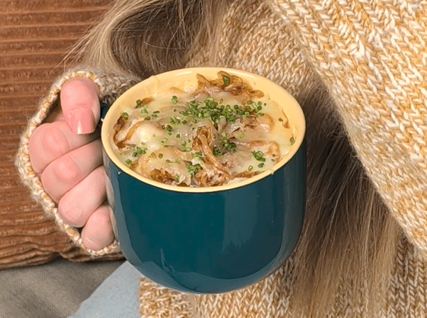 French onion soup meets mashed potatoes in this gourmet Spud in a Mug. Start by caramelizing sliced onions slowly in a skillet with butter or oil until they’re deeply golden and sweet.