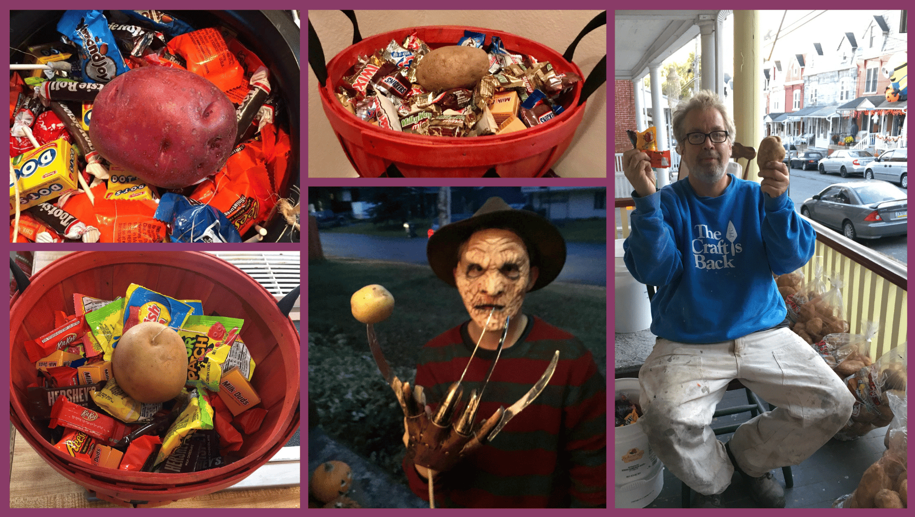 give something out to kids on Halloween, I don’t want to just give them something that makes them go nuts. I’m of Irish descent, so potatoes made sense. I gave away big baking potatoes, and before I knew it, it took on a life of its own. Who would’ve thought?”